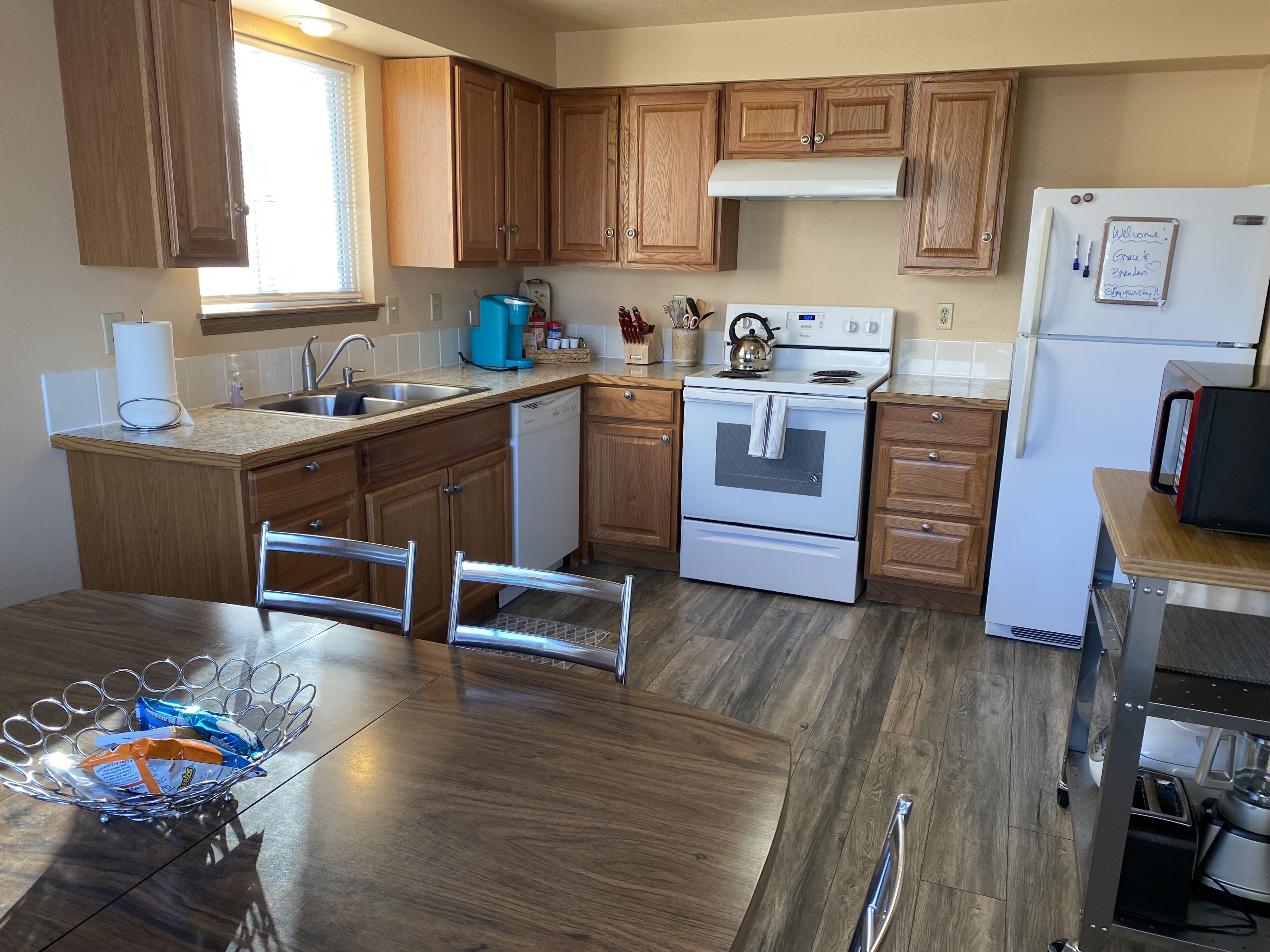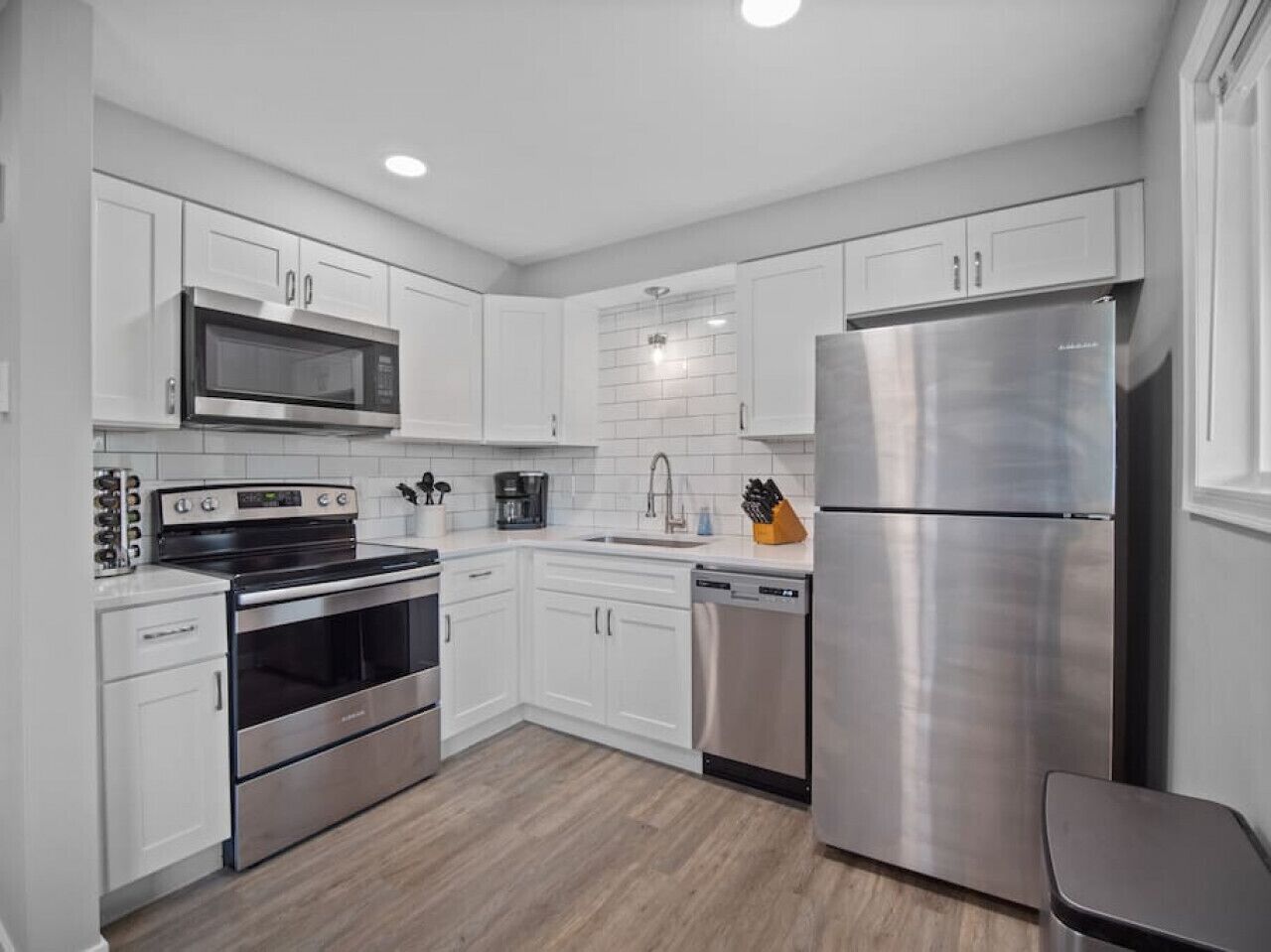 The kitchen has brand new appliances, cabinets, Keurig coffeemaker, blender, cookware, pots and pans, wine glasses, and a wine opener. There are plenty of dishes and silverware for a nice dinner or a family breakfast. You will also find coffee, tea, oil, salt, and pepper.