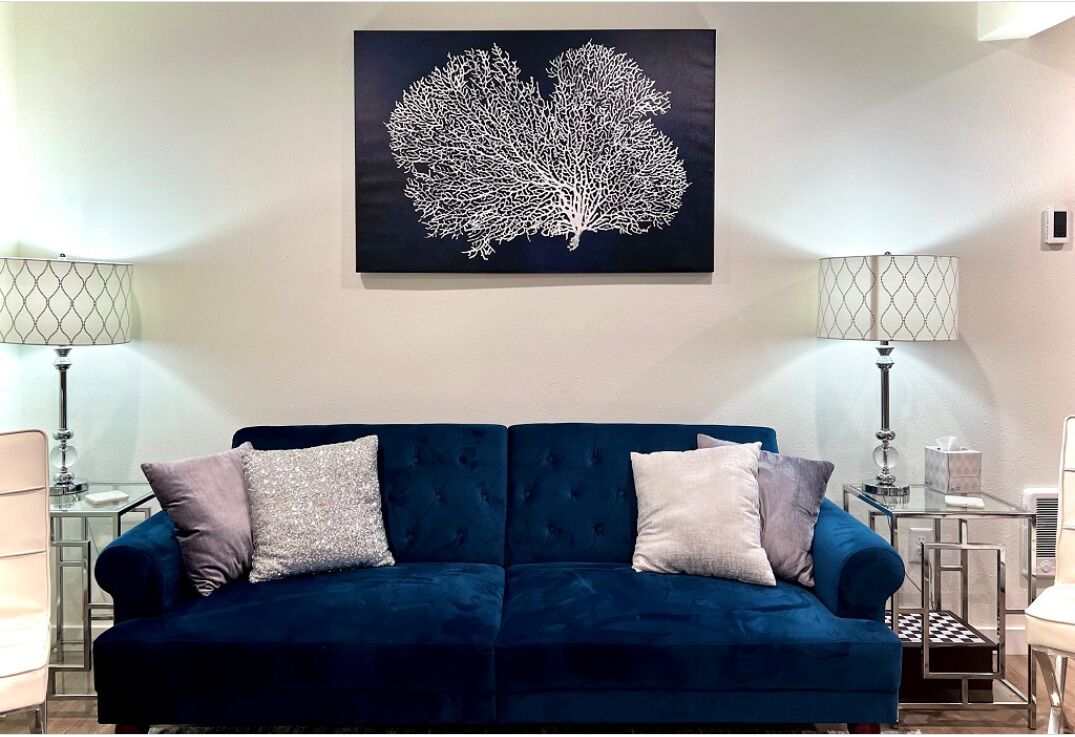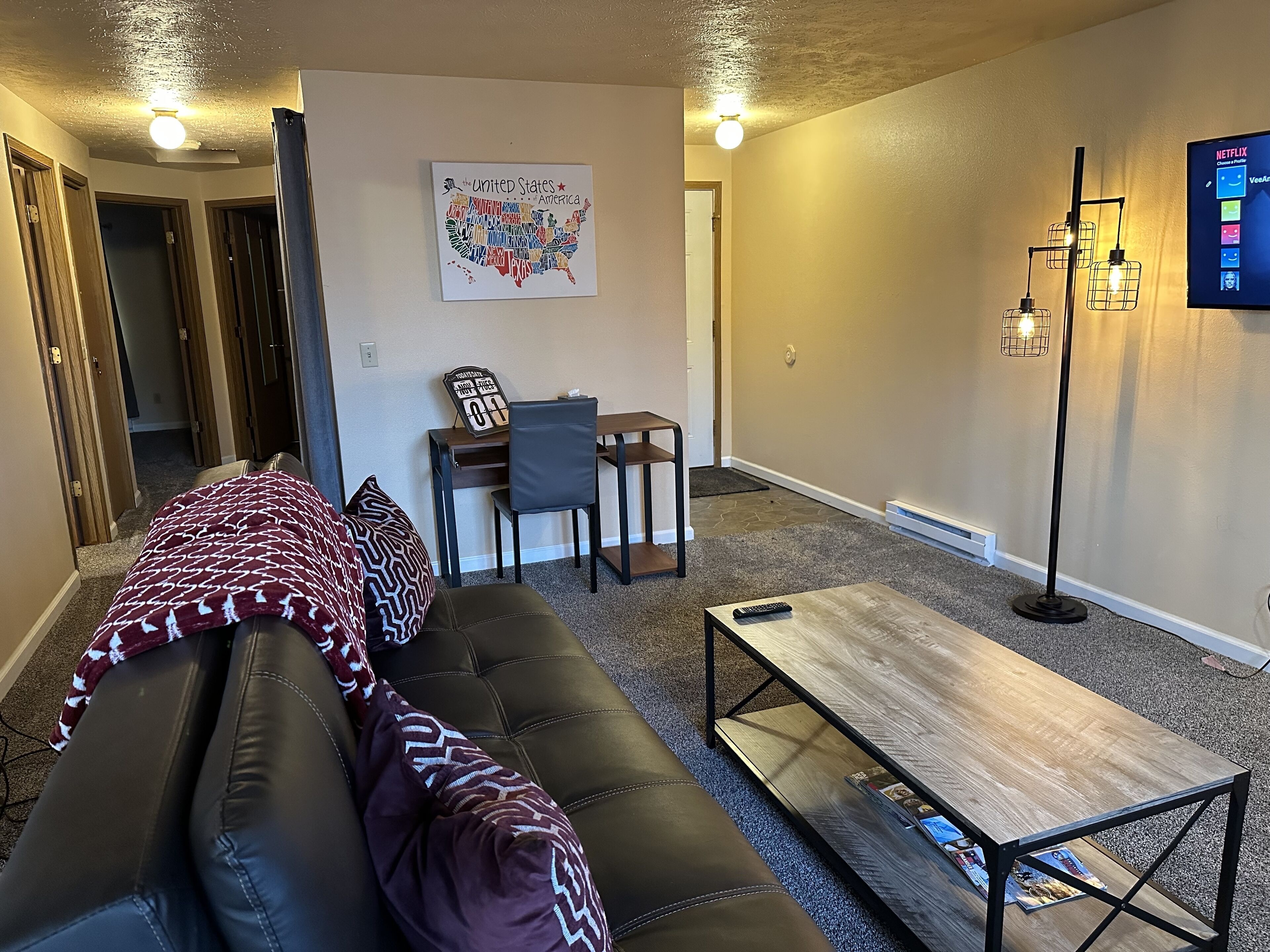 The modern lounge features a large comfortable sofa with a 50” HDTV smart tv where you can log in and stream from your personal accounts such as Netflix. The classic layout and carefully selected decorations create the perfect space to relax after a long day of work or exploring Spokane.