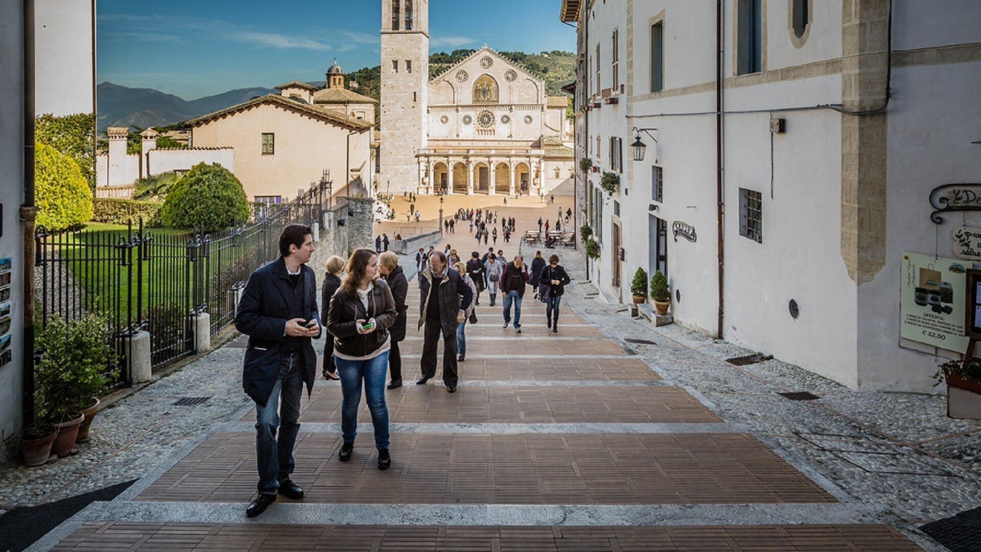 While Terrazza Duomo is not on the main drag and, consequently, not in the noisy hubbub of city life, it is within a few minutes radius, in any direction, of plenty of shops, bars and restaurants. The main "action" takes place in "down town" Spoleto, a 10 minutes, inspiringly beautiful, downhill stroll. Then, rather than walk back uphill, you can take the escalator, a 10 minutes pleasure ride that takes you upwards and above the roof-tops, on a covered but open moving staircase, which delivers you finally to just above Terrazza Duomo, at the entrance to the Rocca.