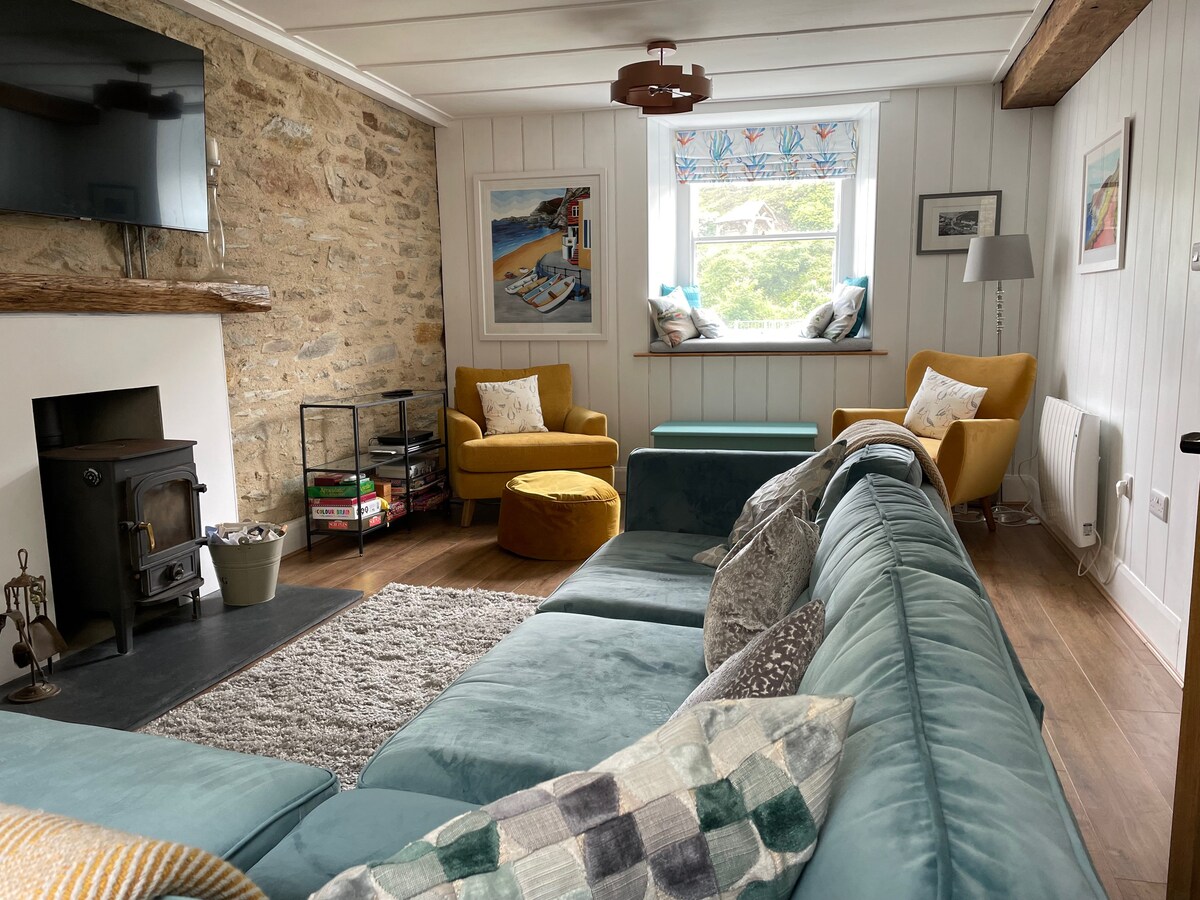 Step into the delightful cottage, situated up a little lane in the heart of St Agnes, to be welcomed into the open-plan living area. To the left, sits the cosy sitting area, with two characterful chairs and a plush sofa. There's a warming wood burning stove, casting an atmospheric glow throughout the cooler months and a small television with a DVD player. To the right, is the beautifully presented kitchen, offering everything you'll need during your stay. Including a four-ring induction hob, electric oven, fridge, dishwasher and washing machine. There is also a lovely dining table with seating for four guests.