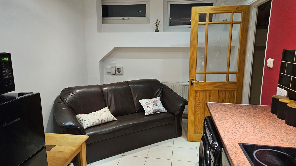 This is a fully self-contained space with your own front door. The flat is attached to the rest of the house where I live. There is double bedroom which includes a desk/workspace, comfy lounge chair and large wardrobe. There is a hairdryer in the wardrobe. The bathroom has an over-bath shower, toilet and wash basin, there is no facility to use the bath. The kitchen/sitting area is fully equipped with microwave, oven, gas hob, kettle, toaster, and washing machine. Tea and coffee is in the cupboard for your use, as well as a cafetiere (please bring your own ground coffee if you wish to use this). The fridge is in a cupboard in the hall along with an iron, ironing board and clothes airer.