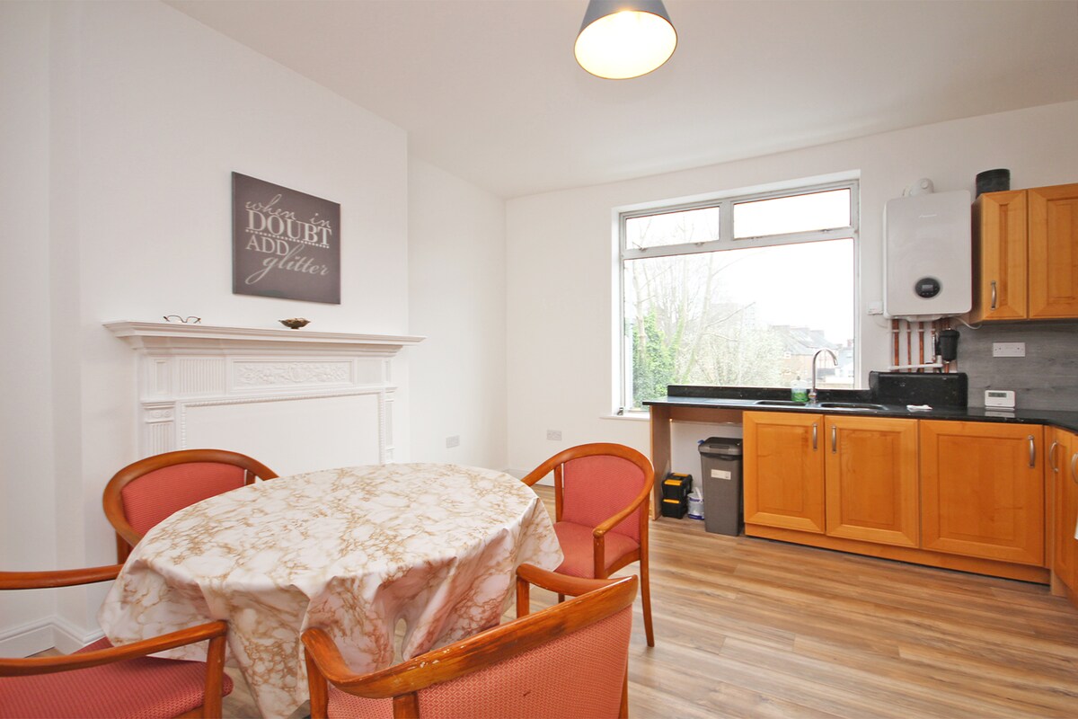 20 mins from London by train and free parking at the house . Bus journey to Thameslink fast train to London centre. shared main house entrance but lockable flat. .