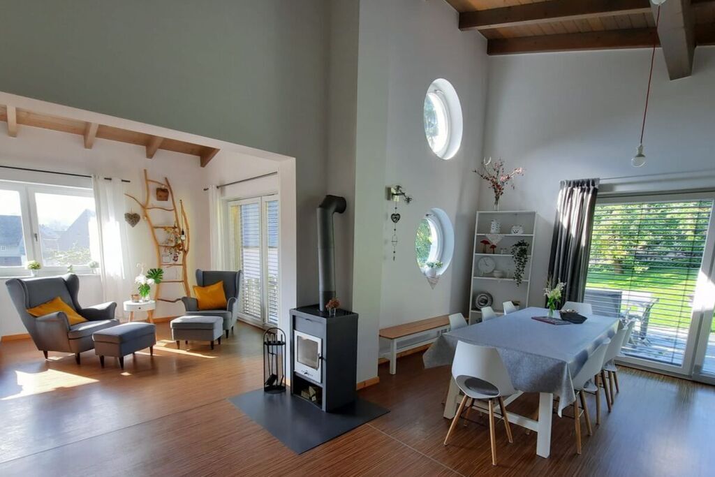 Welcome to the Ore Mountains! Our modern house has approximately 130 square meters of living space and is suitable for 2-9 people. It is high quality with four bedrooms, two bathrooms and underfloor heating. In the generous FH you can expect light -flooded rooms with large window facilities that give you the feeling of participating in nature in every season. The spacious (60 m2) and cozy living - dining area invites you to linger. The stove donates heat on cold days. The playroom makes children's hearts beat faster and relax. The large terrace is equipped with a seat set, parasol, sun lounger and Thüros grill. On the 1300 sqm natural property, near the forest, you can enjoy your vacation.