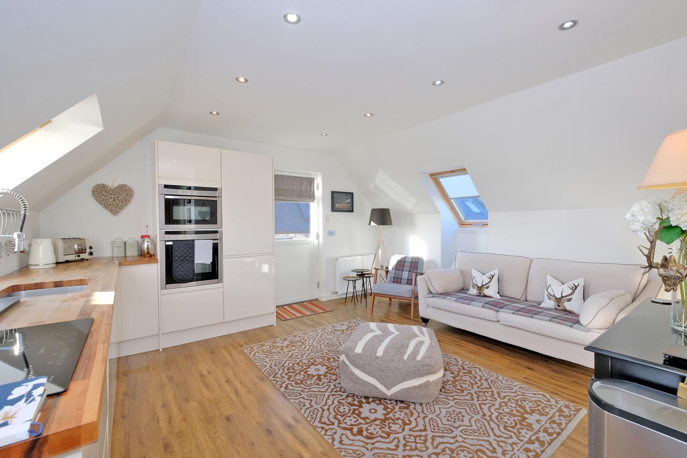 Open-Plan Living Space: The fully equipped kitchen and living area include a Smeg oven, 4-ring induction hob, and a built-in microwave. Start your day at the small breakfast bar or enjoy a meal at the adjustable round dining table for four.