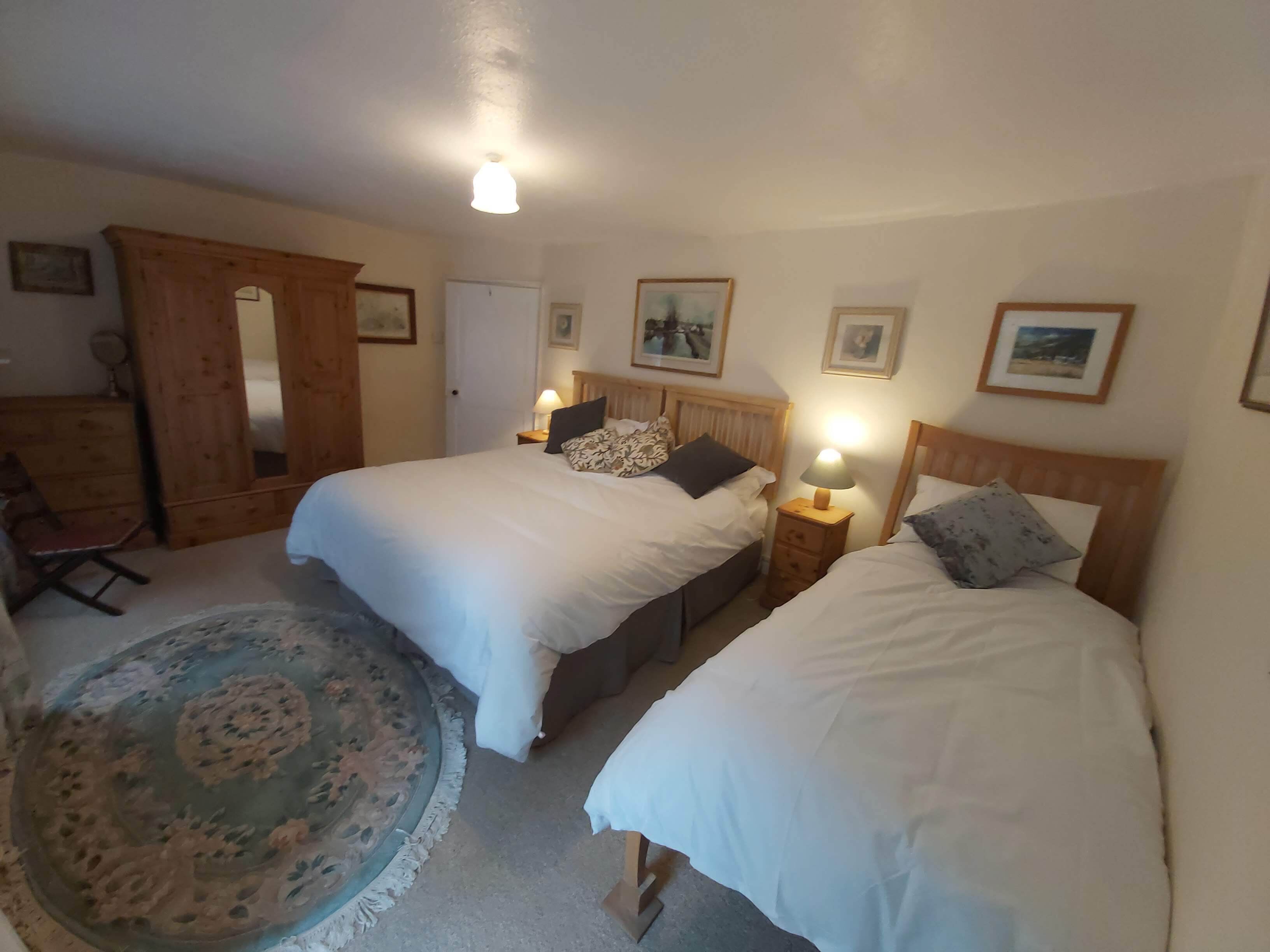 Bedroom Two with quality bed linen, two thick mattress single beds, cupboard with hanging, chest of drawers. Ensuite Shower Room with shower, WC and washbasin.