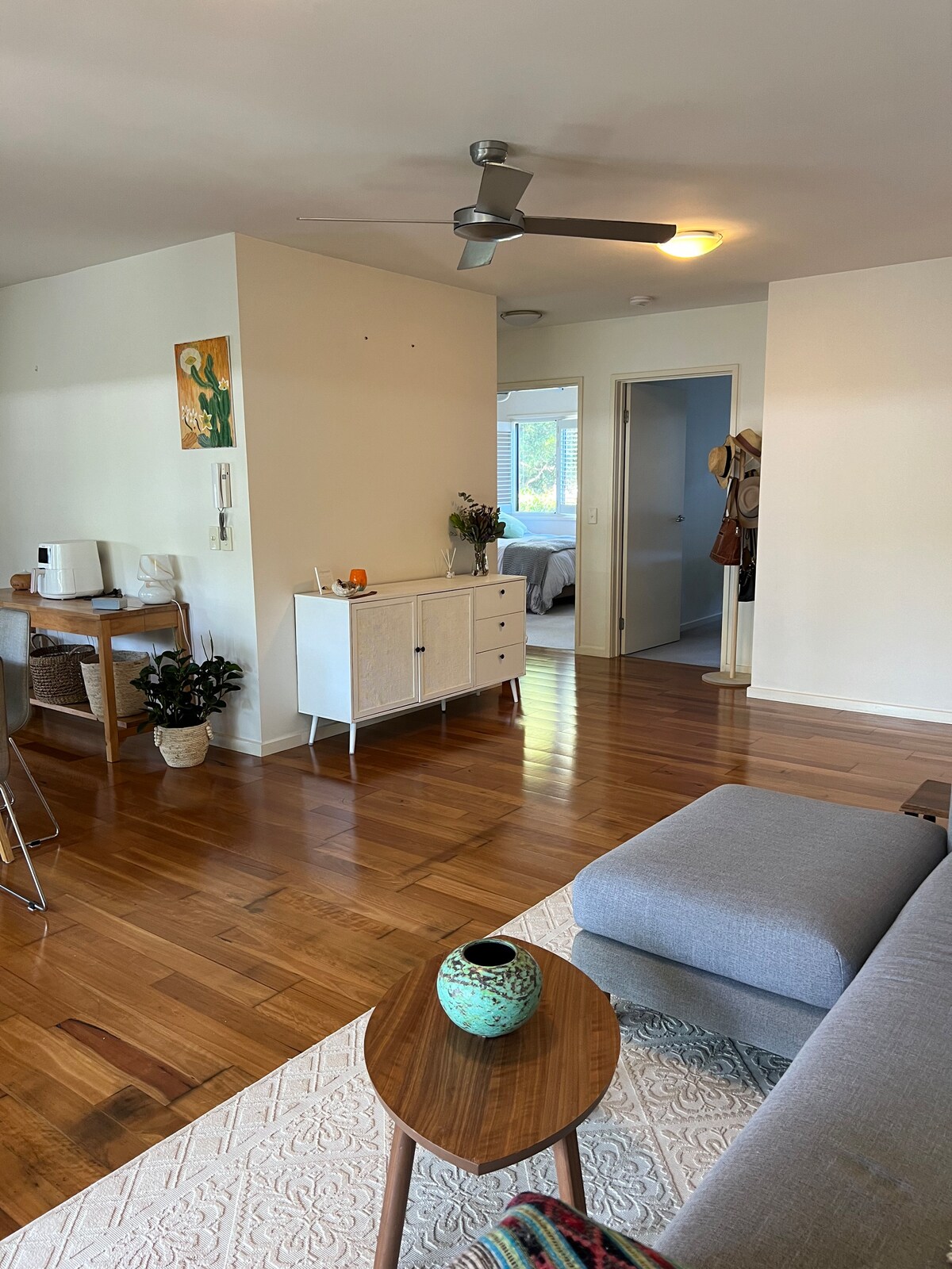 The spacious apartment is tastefully and comfortably appointed. It is 60sq metres, has a bedroom with built in wardrobe, ensuite bathroom, with seperate toilet and powder room, lounge room, kitchen, and large entry hallway. It has lots of natural light and an outdoor sitting area. There is a large dining table and plenty of room for any business needs and good wifi broadband. It is cool and has ceiling fans. The decor is creative and eclectic. Continental Breakfast of croissants, museli, coffee or tea is provided. There is a coffee cart and a great convenience store at the end of our street next to a large park and lake. If you walk up the hill from the house you enter a quiet secluded rainforested area with houses dotted in amongst the trees. Tallows Beach is 4 minutes away by car and the town centre is 7 minutes away. Taxis and Uber are available. There is a small shopping centre with bottle shop, restaurants, supermarket and great baker nearby.