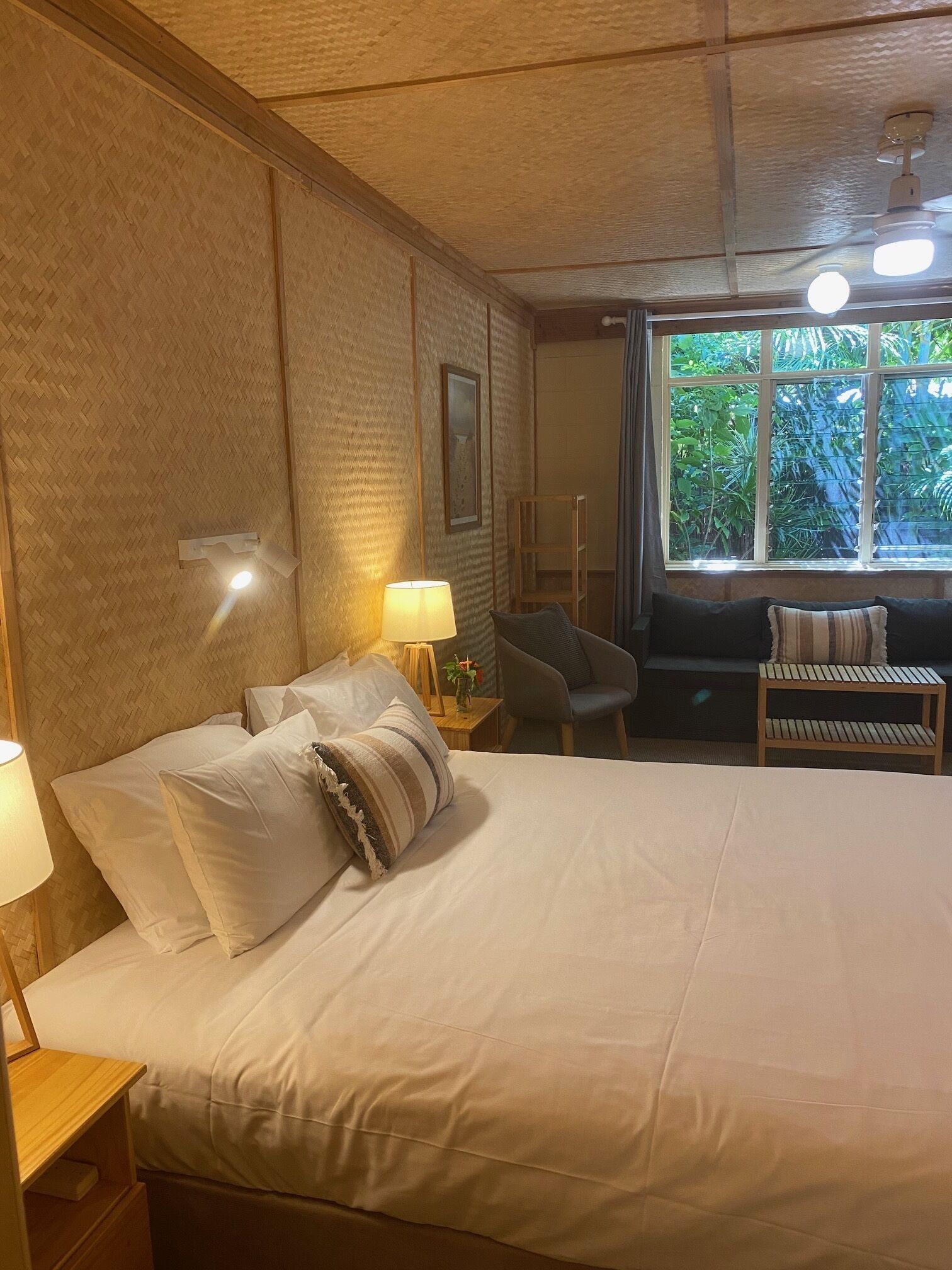 Situated in a peaceful location, across the road from the iconic dog-friendly Tallow Beach Byron Bay. This motel room is very large 28m2 room with king-size and a queen size bed, ensuite, shower/ toilet/ ceiling fan, Air con, TV. & Desk space. Perfect for two couples or a small family.