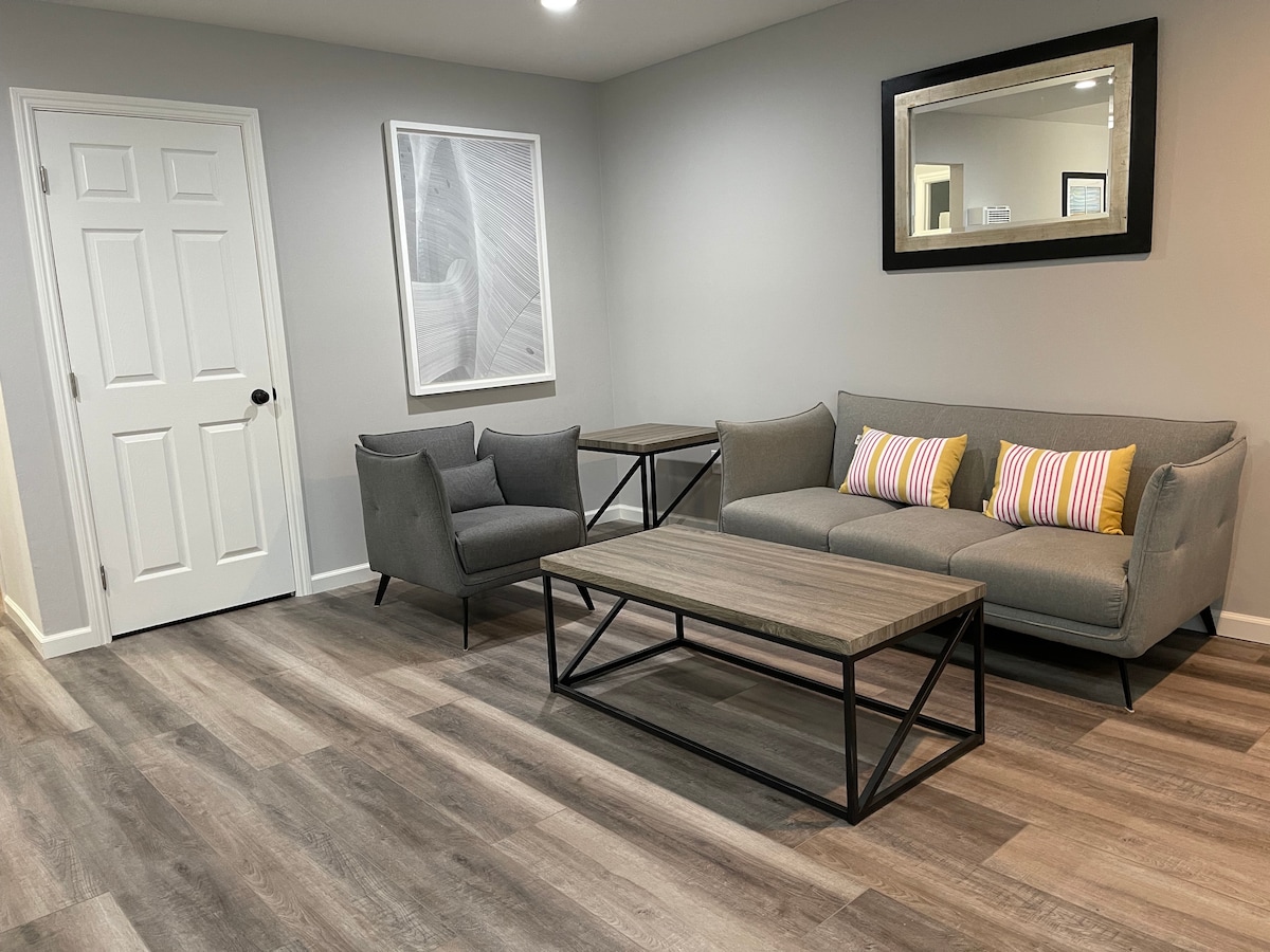 This is a luxury modern newly-built one bedroom corporate unit in a single family house. It is completely self-contained and built with luxury in mind, including a full-size kitchen, full-size washer and dryer and its own AC/Heater unit. It is insulated from the rest of the house and has a private entry.