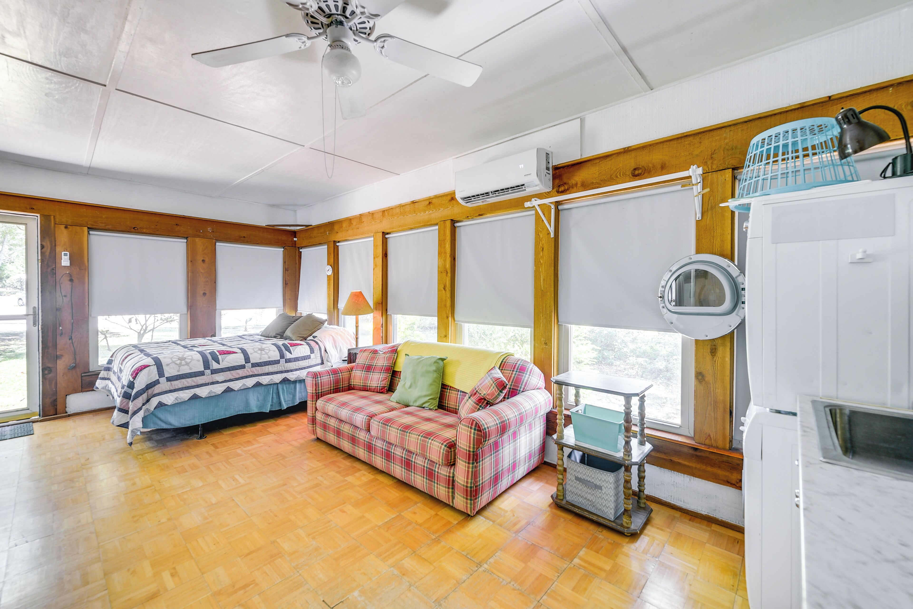 We offer one bedroom with a queen bed, twin bunk beds, refrigerator, microwave, coffeemaker, 55-inch smart TV, and high-speed internet.