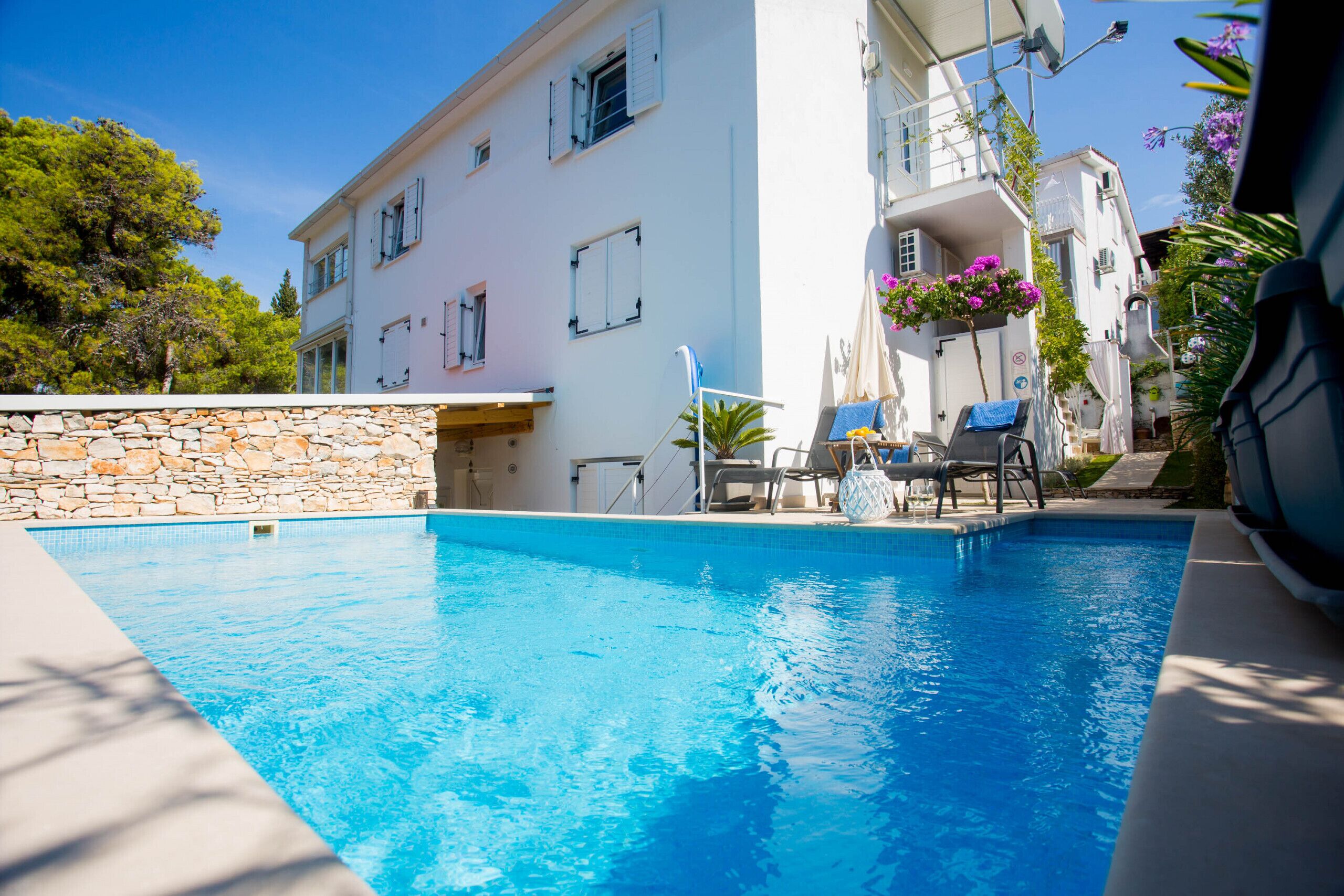 You will be struck first by the wonderful location; close to the beach and with panoramic views of the lovely Dalmatian coast. The short walk into the village allows a sense of seclusion, yet restaurants, bars and shops are only minutes away.