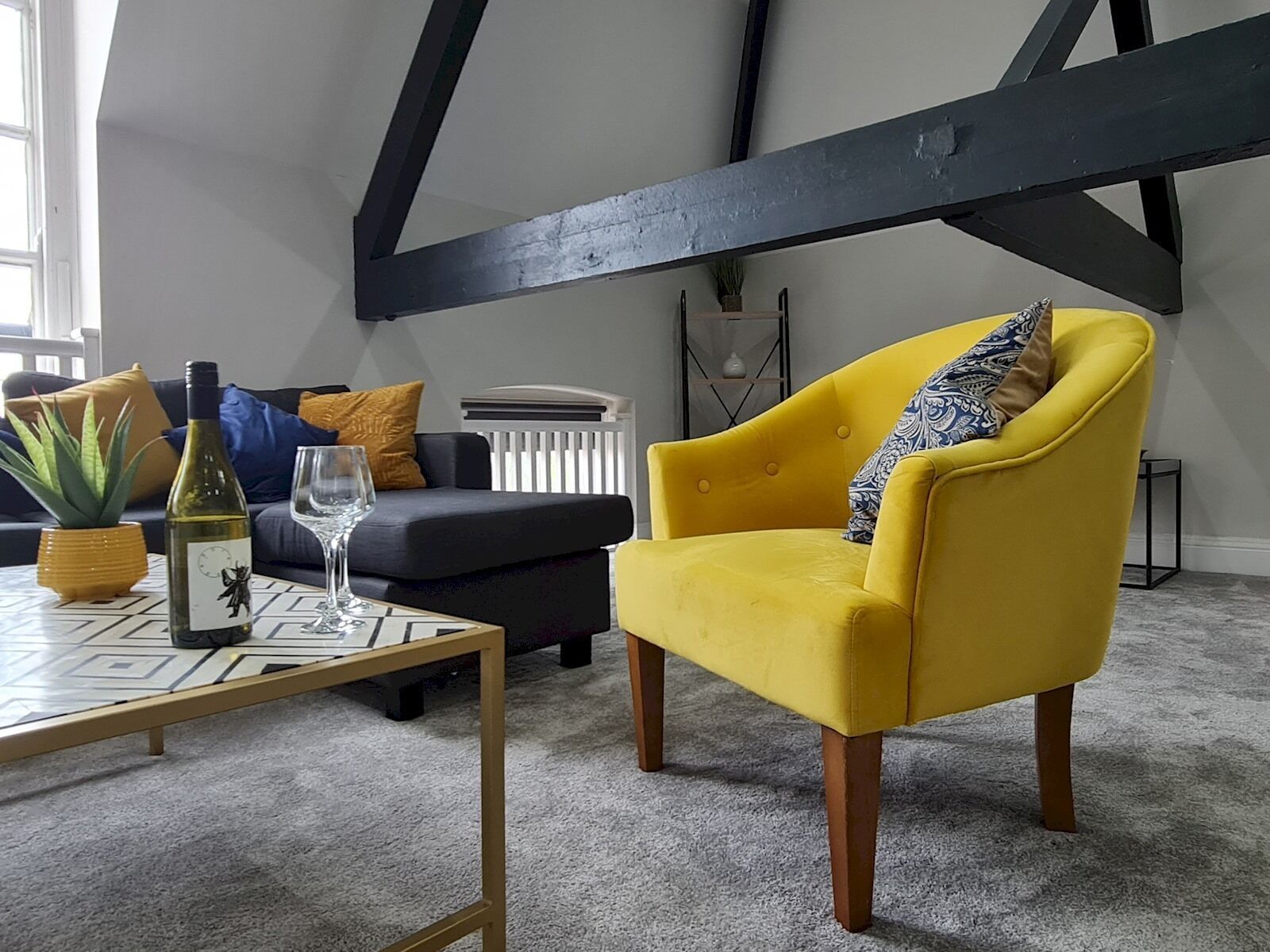This beautiful high-end apartment has all the furnishings and fixtures for a stay away from home. Set over 2 floors, upstairs is an open plan living space. The beautiful kitchen has fridge, freezer, oven, washing machine and dishwasher, as well as appliances for a comfortable stay. There is an L-shaped sofa for relaxing with TV, and a dining area with table to seat 4. A large original oak beam intersects the room providing an office space with desk for working away from home and the office, supported with high speed Wi-Fi for internet access.