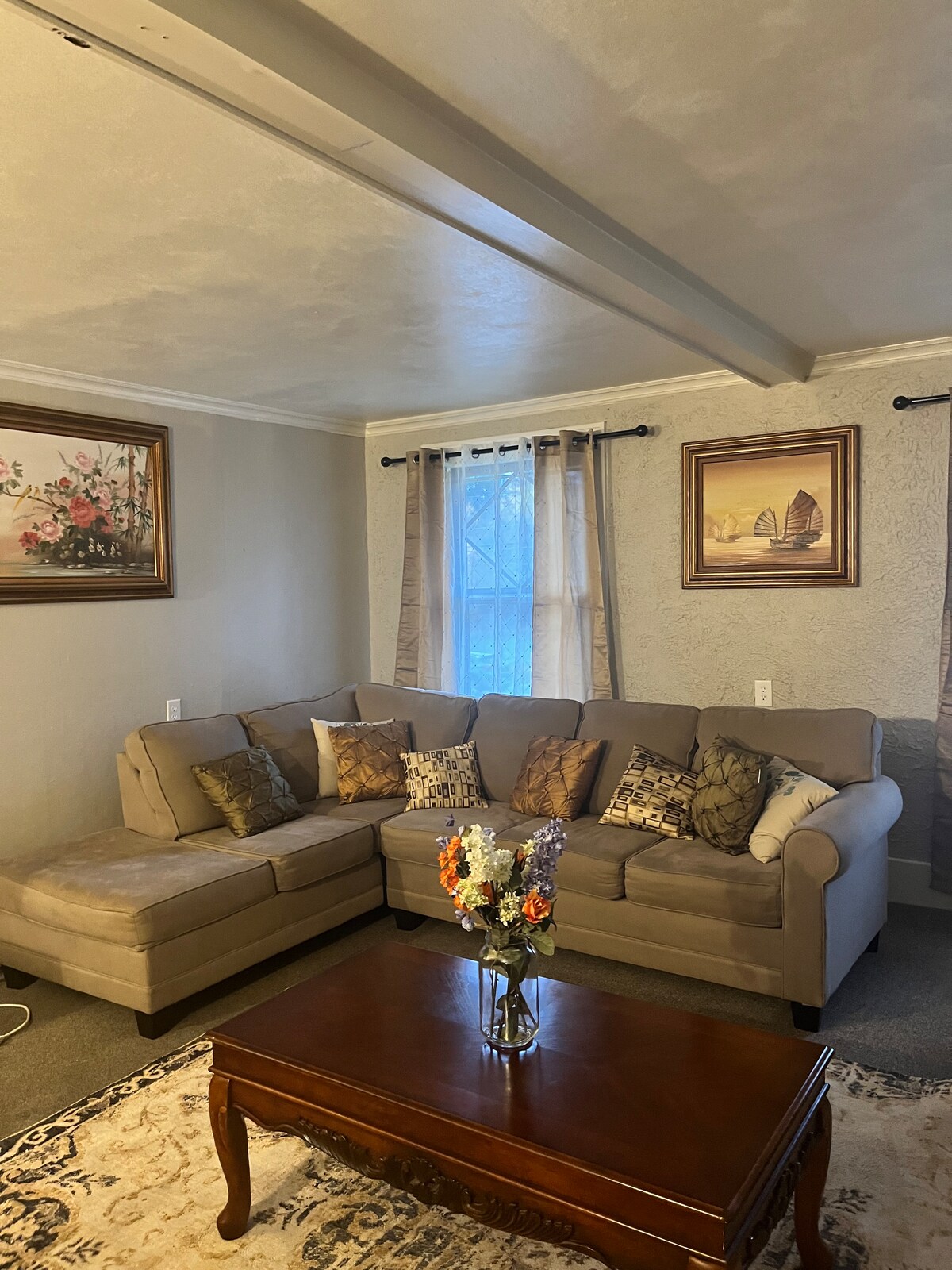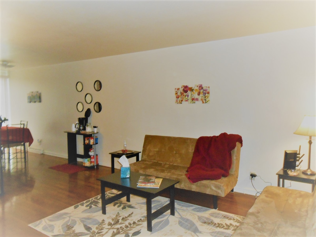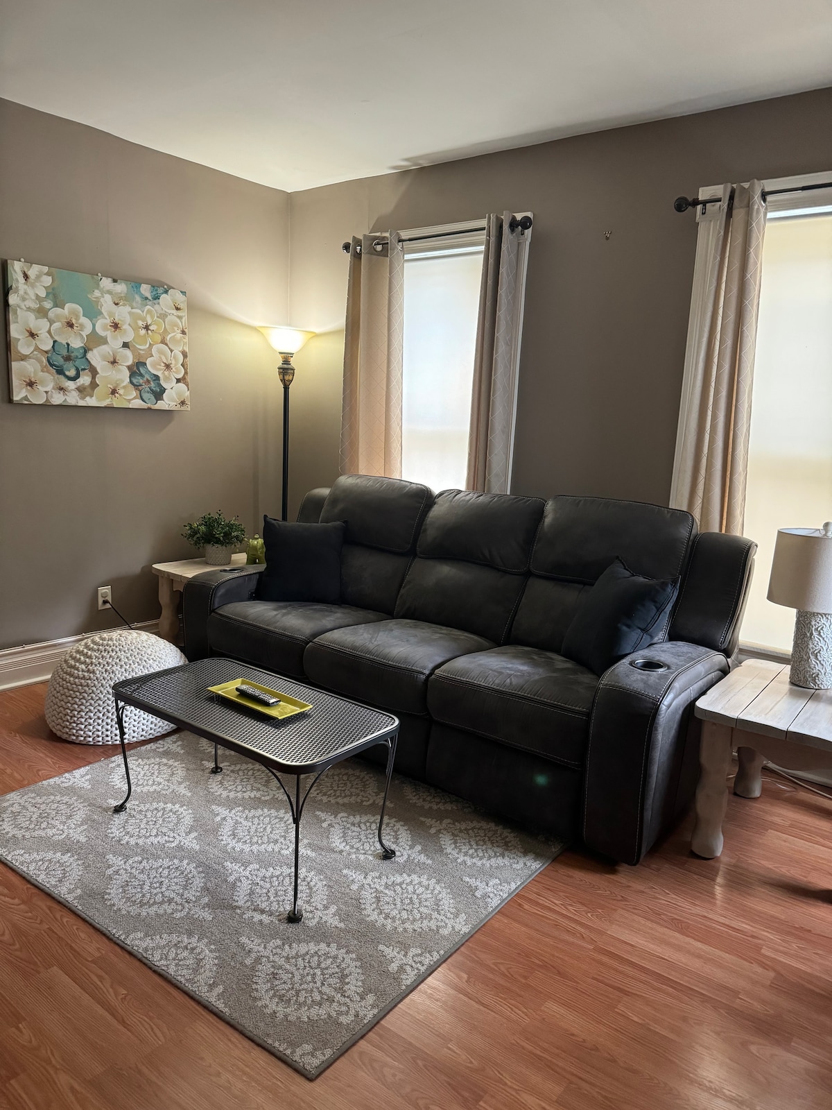 Attached Townhouse - first floor has Living room, dining area, hot beverage station and full kitchen. The second floor has 3 bedrooms and a shared bathroom. Laundry access in private basement. All hardwood floors and fully furnished AC only in bedrooms