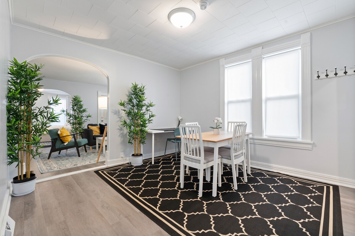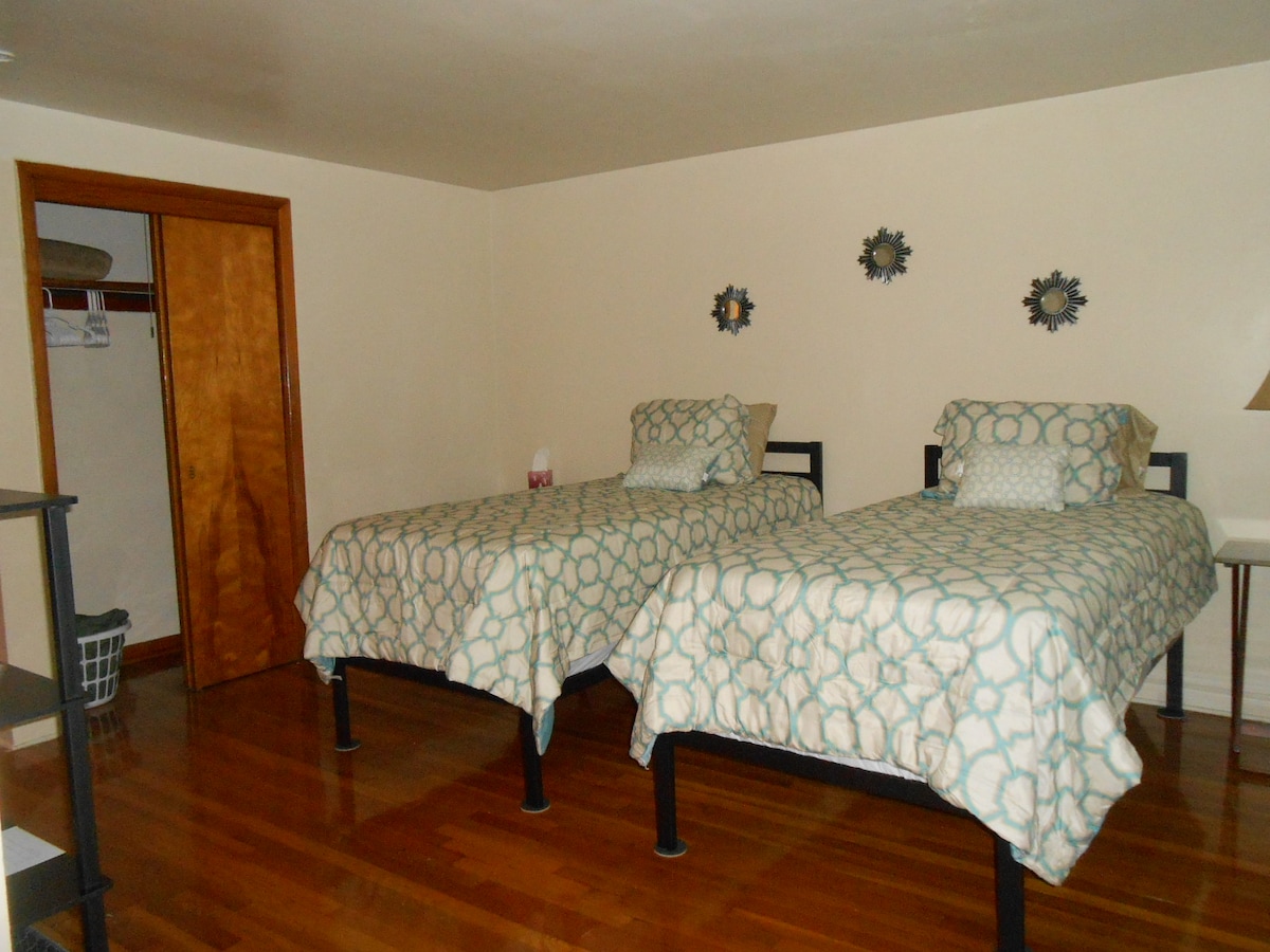 Attached Townhouse - first floor has Living room (with 2 futons), dining area, hot beverage station, and full kitchen. The second floor has 2 bedrooms and a shared bathroom. (Bedroom 1 queen bed, bedroom 2 has 2 twin beds) Laundry access in private basement. Hardwood floors and fully furnished AC only in bedrooms