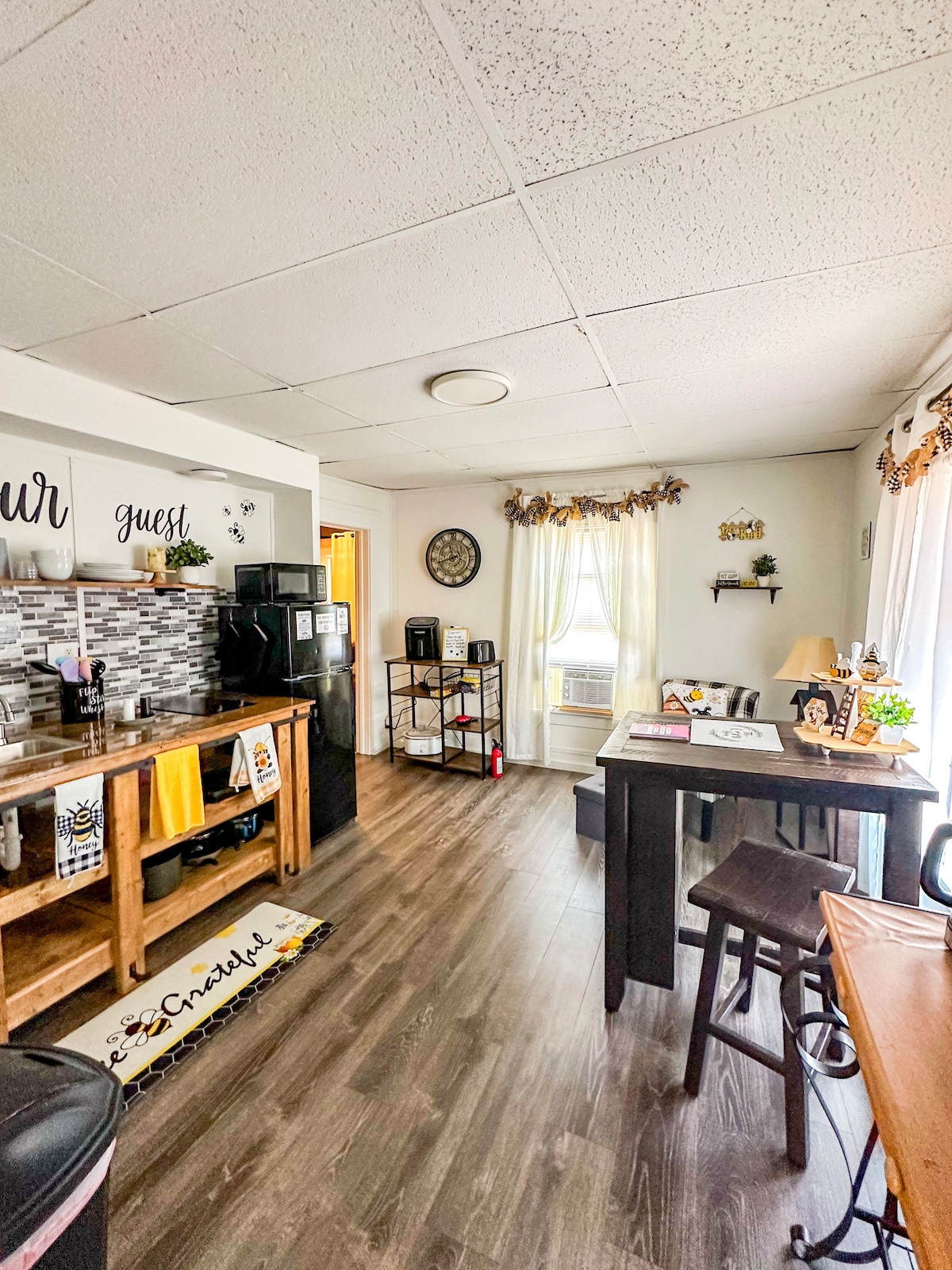 Kitchen is equipped with an apartment size refrigerator, 2 burner stove, microwave, air fryer & toaster (no oven). A coffee bar that offers a kuerig or a conventional ninja coffee pot. We have a few k cups stocked to get you started with the convenience of to go cups. The bedroom has a queen size bed with a dresser, closet, luggage stand & tv with a Roku so you can sign into your streaming services. Bathroom has a full shower with shampoo, conditioner and body wash.