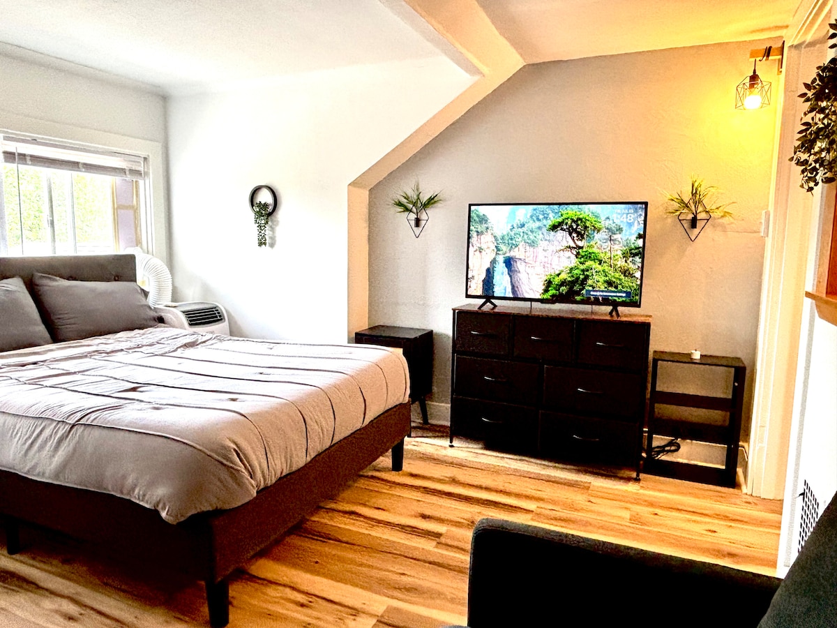 This charming upstairs studio offers the perfect blend of privacy and convenience.Complete with a kitchenette, a comfy bedroom and a spotless private bathroom. Come unwind where comfort meets convenience. This studio is located close to the city’s business district with some lively neighbors but once inside, you’ll find a quiet comfortable space that feels like home. Whether you’re here for work or a quick getaway, enjoy the convenience of the location without sacrificing comfort & privacy.