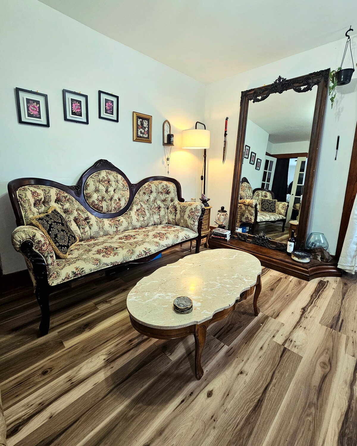 My home is on the 2nd Floor and furnished with antique furniture to give a victorian aesthetic with plants, and local art around the living areas.