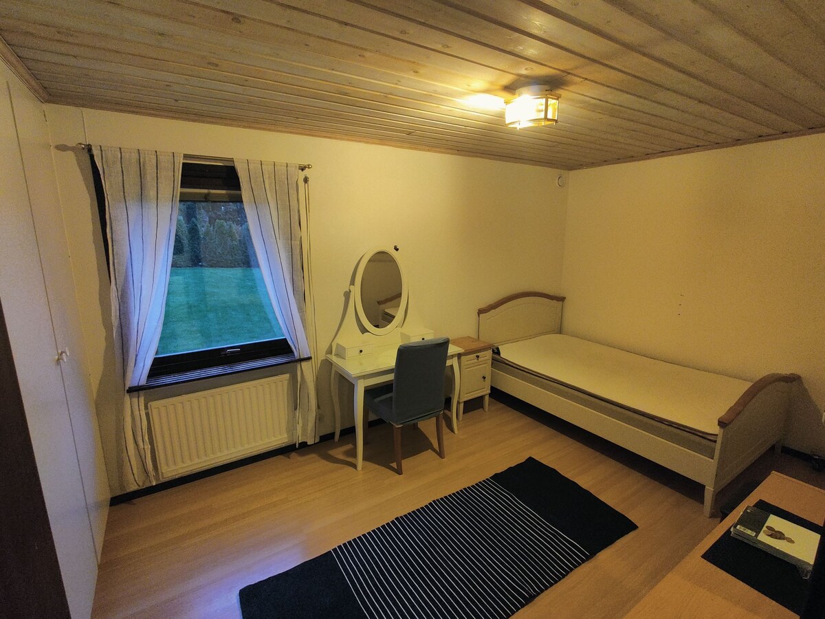 Private apartment in our villa. Suitable for one person or a couple (the bed is 120 cm wide). Extra bed is in the storage room by the toilet. You have your own entrance, a room, storage room, small kitchen, toilet, bathroom and sauna. Access to parking space. Access to gym in the garage. A patio where you can drink your morning coffee. Proximity to nature and outdoor areas. About 700 meters down to the beach by the lake. About 2.5 km to a big shopping mall. About 20 km into the center of Stockholm. From Arlanda Airport it is 30 min by car.