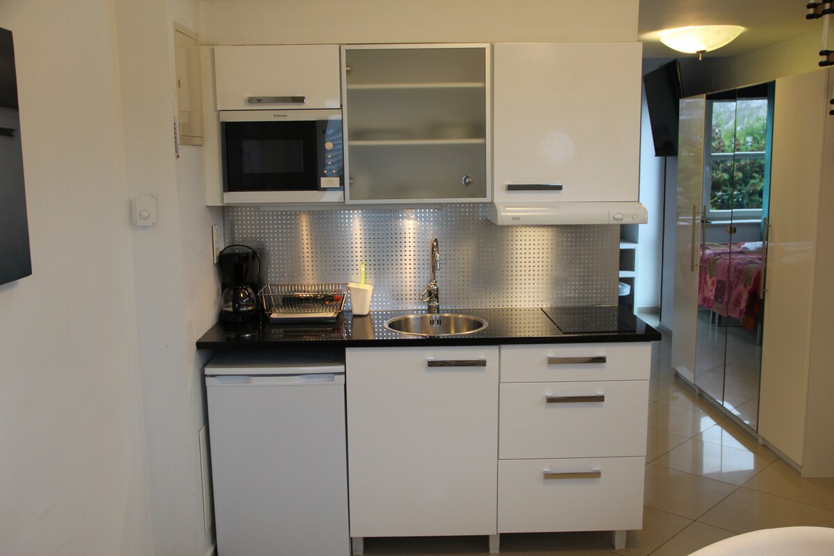 This smart studio apartment (34 m²) boasts a private balcony and is furnished with a double bed (140 cm), a dining table for two, a small couch, an office with a proper chair on the loft and offers ample storage space for your belongings. It is ideal for 1 guest but the bed fits 2 people snugly.