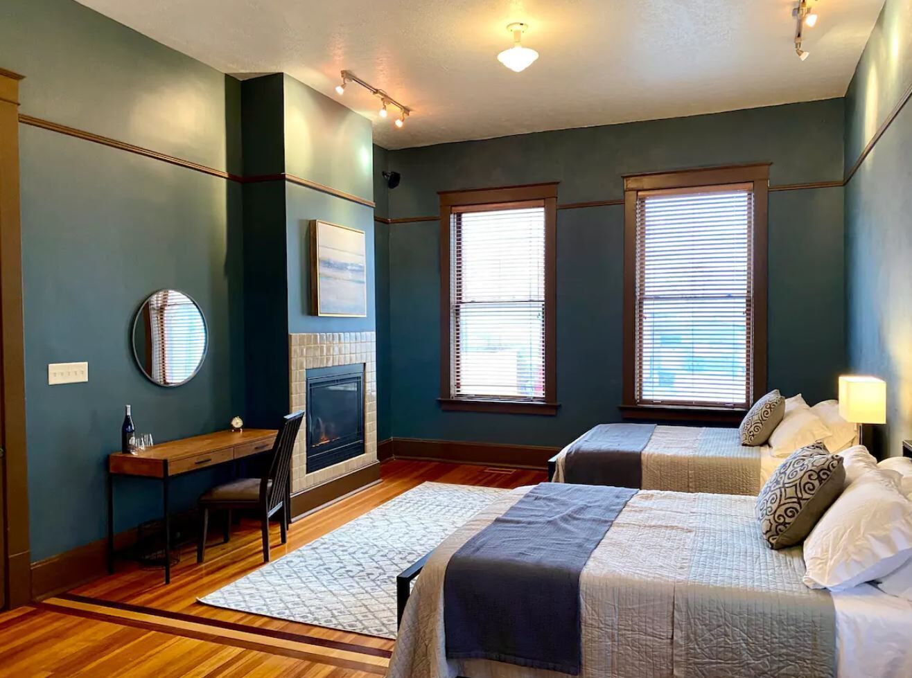 You’ll be staying in one of the apartments located in the Historic Parke Hotel, built in 1880. This recently renovated apartment has all of the modern conveniences: a walk in shower, 2 smart TVs, 8 large windows, and a full kitchen including a dishwasher. A breakfast nook and TV trays are available for your use. The bedroom has a queen bed and closet. The large front living room also has a queen bed. Two hall closets will give you plenty of room to store your belongings. A washer and dryer are available in the building for your convenience.
