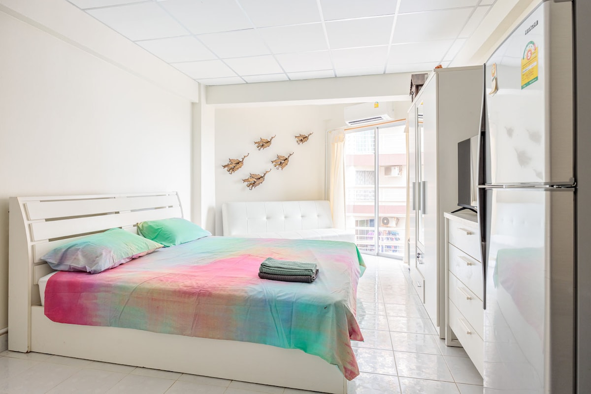 Immerse yourself in the comfort and cosiness of our beautiful studio, where you will find a king-size bed and a fully equipped kitchen with all the bells and whistles. You'll feel right at home, but with the added benefits of Wi-Fi, a luxurious pool, a full-fledged gym, and a rooftop with mesmerizing panoramic city views. All this in a convenient location, close to 24/7 FamilyMart and 7-Eleven stores, as well as within walking distance to the ringing waves and golden sand of Jomtien Beach.