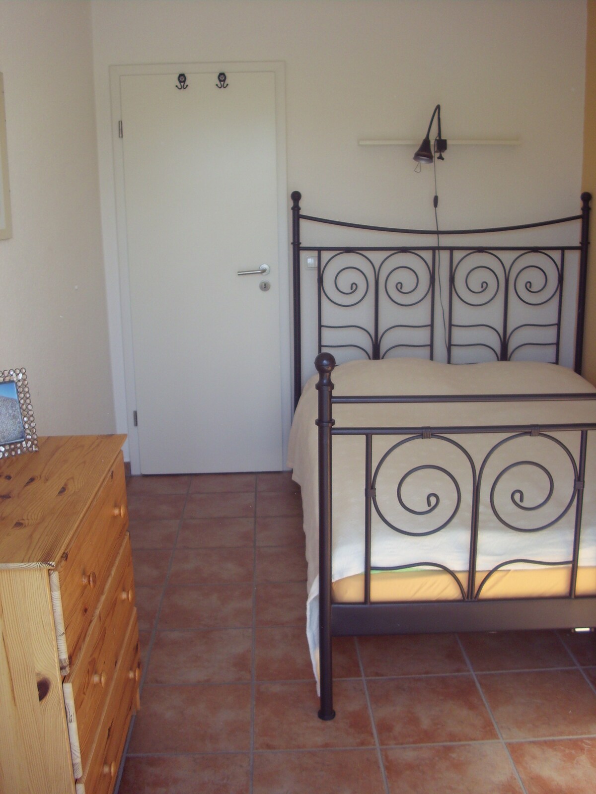Small is the room with the 1.40 m wide bed already, but it is wonderfully bright and you can get from there directly to the furnished balcony.