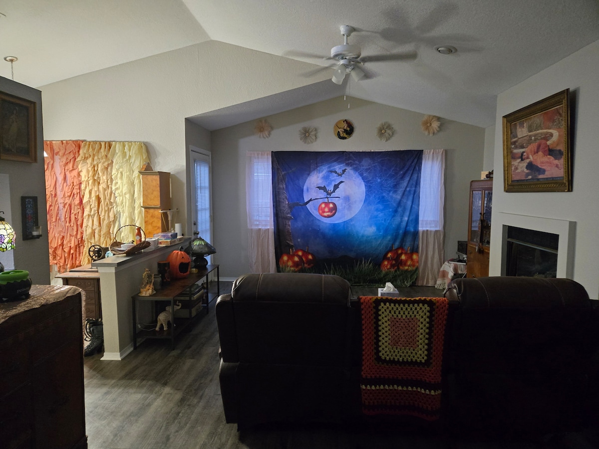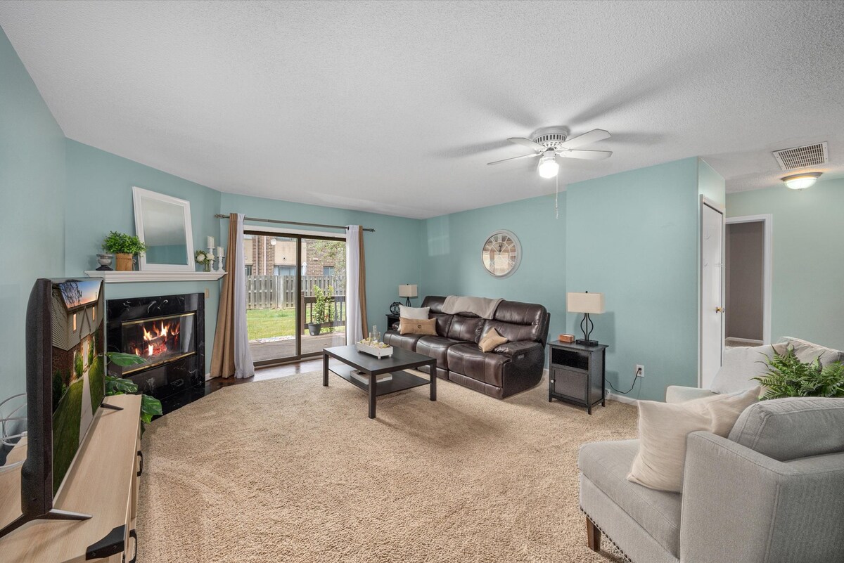 There are two main entrances: 1 through the living room and 1 through the kitchen. The living room has an ornamental fireplace with a tv stand next to it. The kitchen has plenty of cooking basics: regular pots and pans, cast iron and copper pots and pans as well.