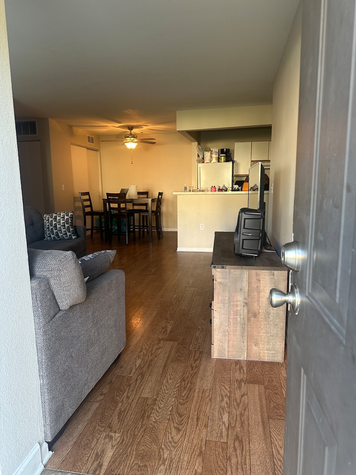 The dining room leads to a short hallway with the small bedroom on the left and master bedroom on the right. The small bedroom is outfitted with a gamer chair, filing cabinet and paper shredder. The master bedroom has a large dresser for clothes.