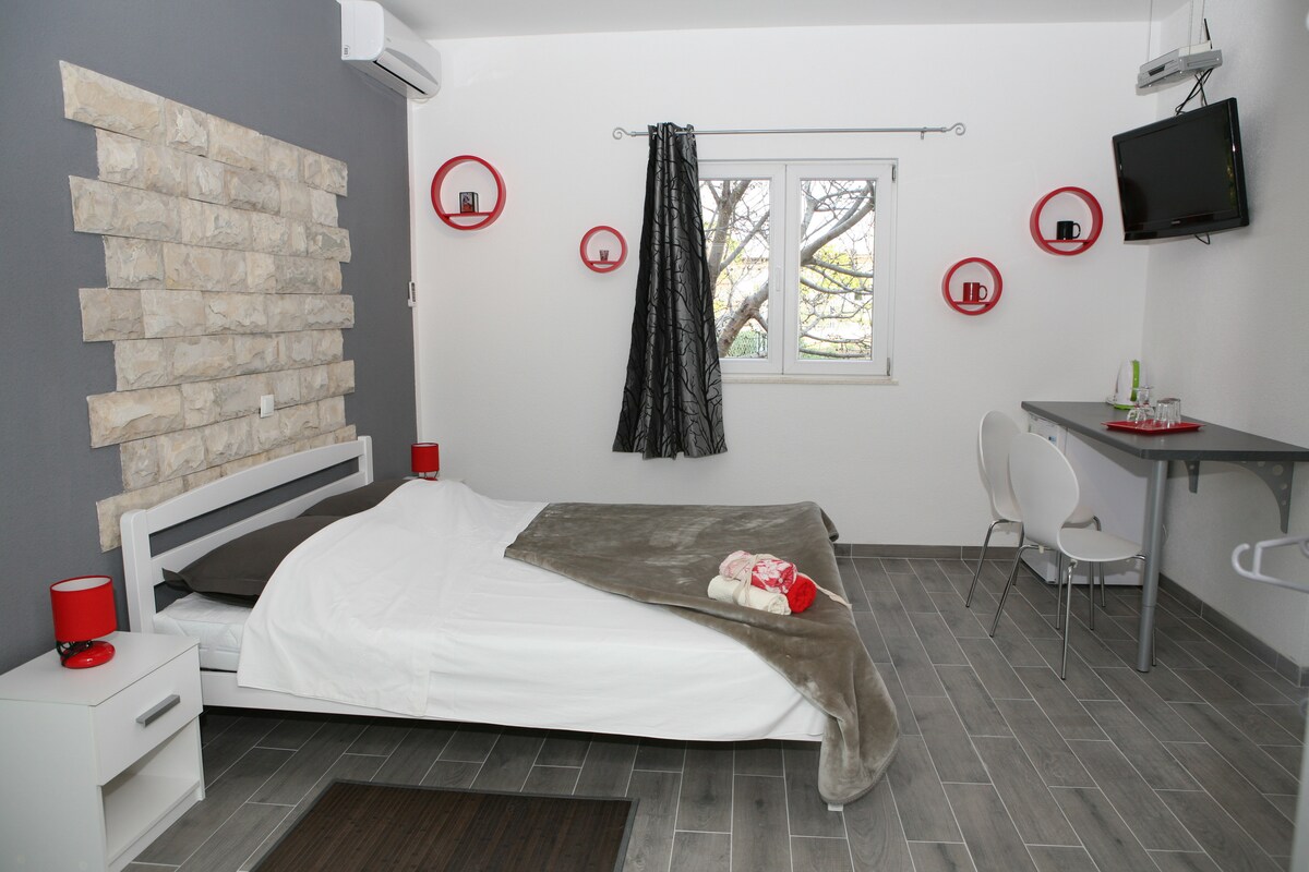 The room is on the ground floor and it has a private entrance, private bathroom, kitchenette and a sitting area on the private, shaded balcony. Wifi available. It is only 150 m from the beach and 10 minutes walking to the Old town Trogir. The room is in a quiet neighbourhood next to the beach .