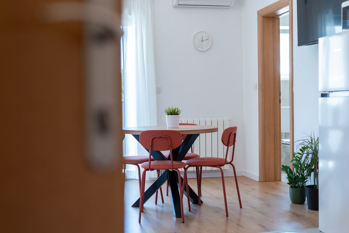 Living room with dining room and modern kitchen (cooker, fridge / freezer, dishwasher). From the living room you will come out to a private balcony offering a spacious and beautiful view of the sea and the surrounding area of Ciovo Island.