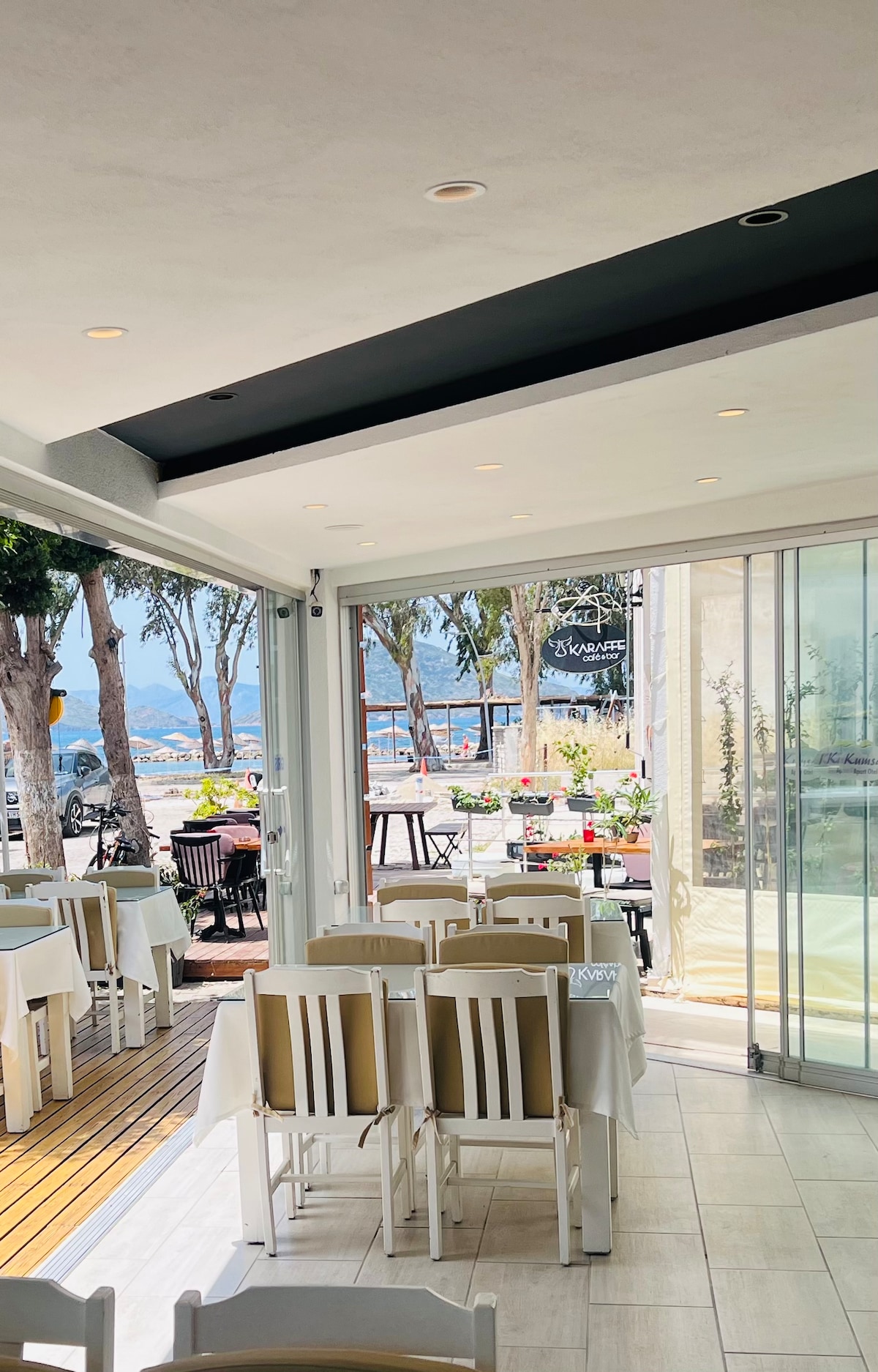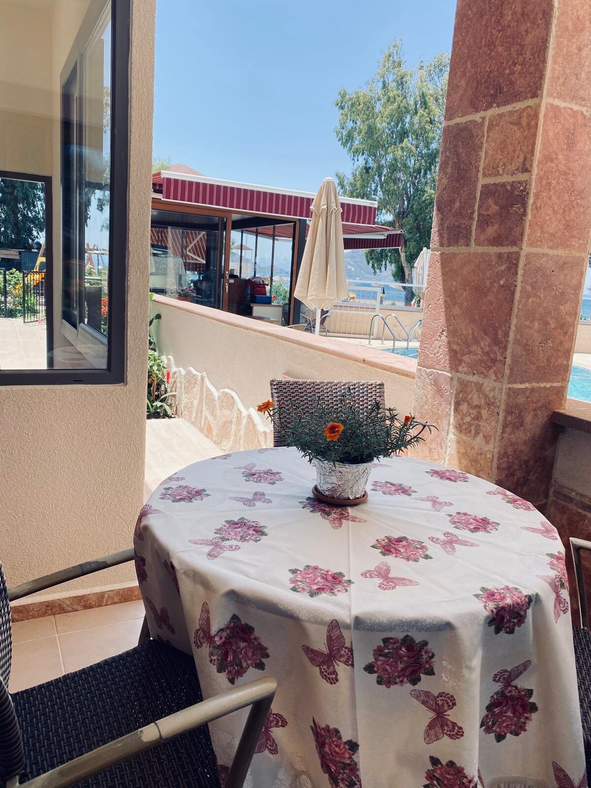 Our apartment is located by the beach in Turgutreis and it has a sea view. This is a ground floor apartment which is very close to the beach. It has sea view from the outside dinning area.