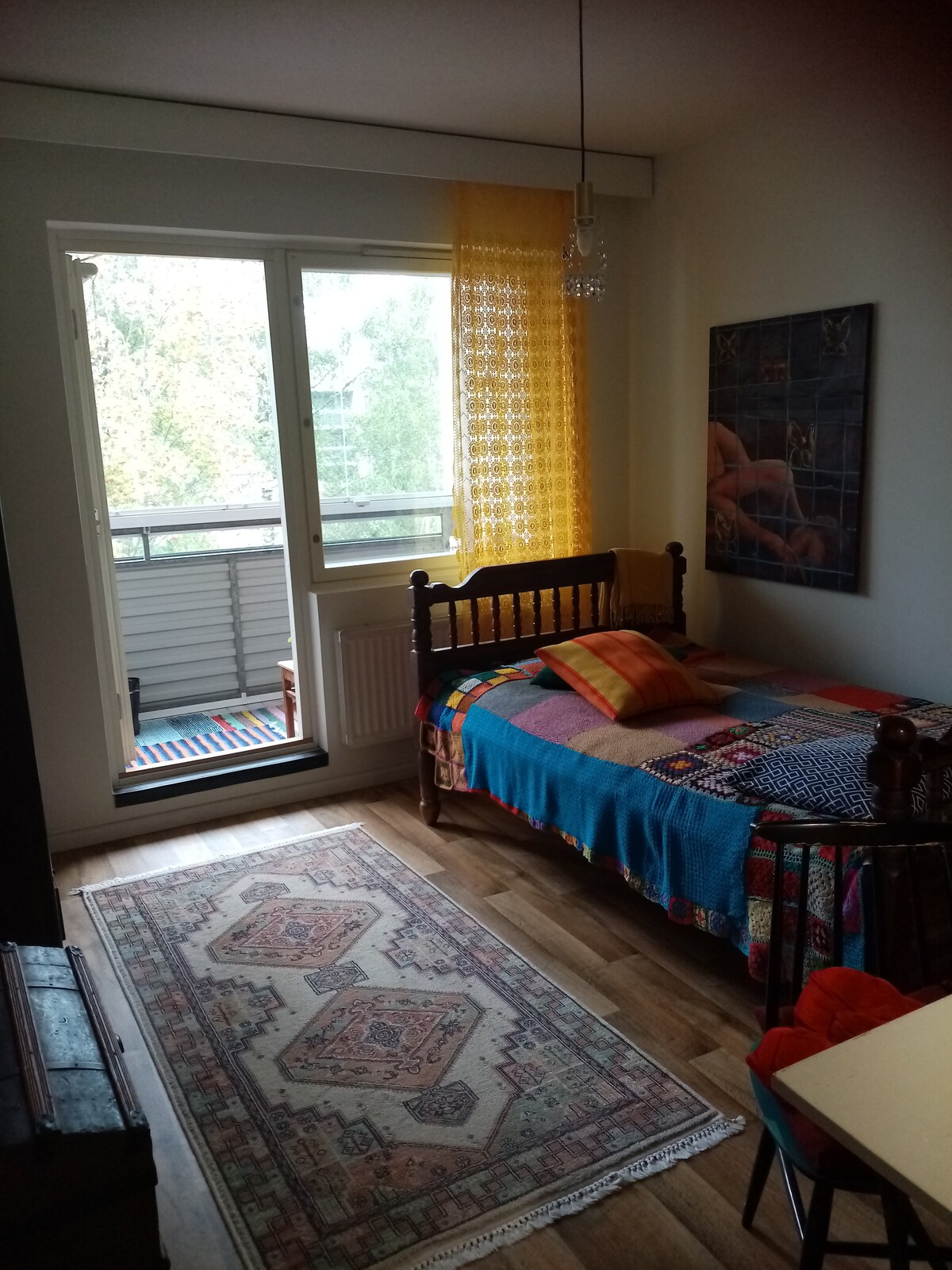 Bedroom in a Rivitalo in very peaceful neighbourhood. Stay with friendly host couple. Close distance to the city center and frequent bus to every part of the city. Living Room with open access to a specious kitchen, one toilet and another toilet bathroom combination, sauna and patio.