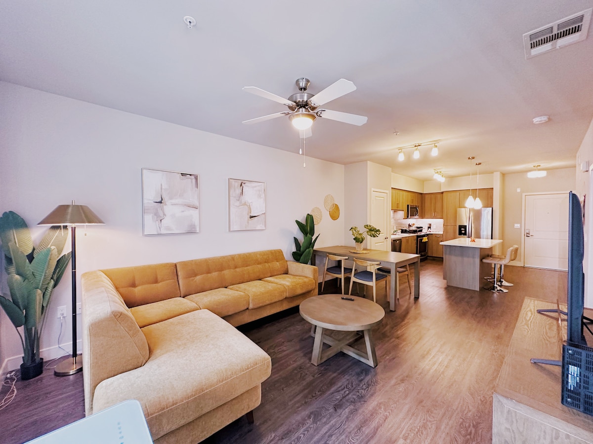 Enter a spacious, open-concept living area perfect for spending time relaxing with friends and family. The living room features comfortable seating, a large flat-screen TV, and high-speed Wi-Fi for all your entertainment needs.