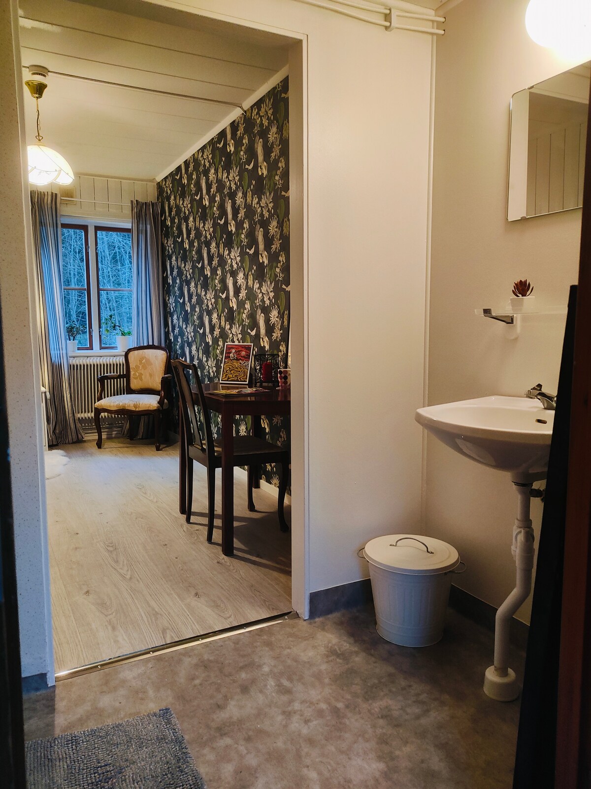 Private shower and sink in each room. Toilets, kitchen and living room are shared with other guests. Free parking on the plot.