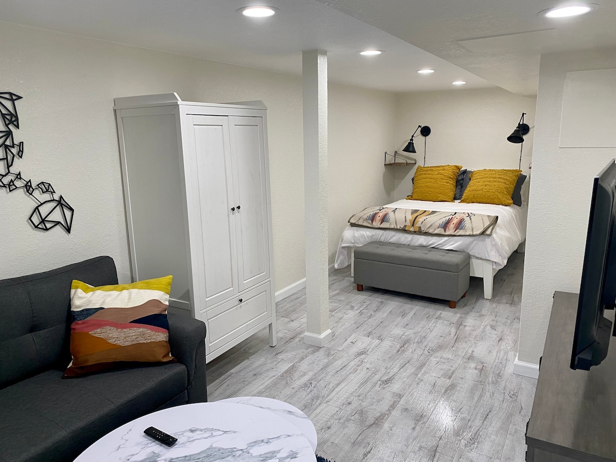 The space is a cozy studio with a full kitchen, living room nook, and bathroom. This home is perfect for a Denver getaway. Cook elaborate meals or chop some wood and roast some s'mores in the fire pit on the patio of our private, lighted courtyard.
