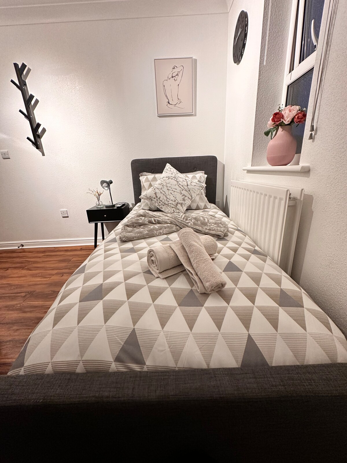 This cosy spacious bright room is situated in modern apartment, complete with all the amenities you need for a comfortable stay. The bedroom features a day bed with soft linens for a good nights sleep.