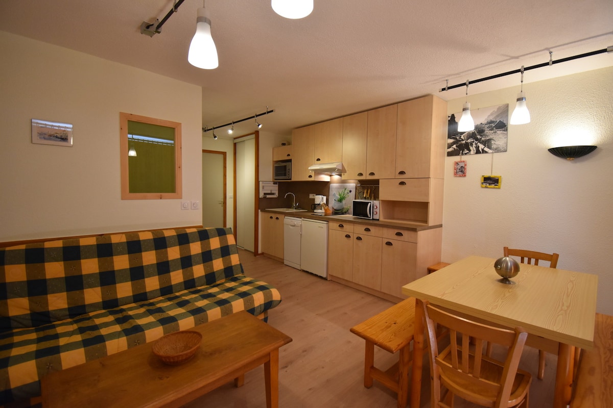 Located in the Le Fare residence, in the shopping arcade at the top of the village, this 36m² apartment sleeps 6 and offers magnificent views of the Grandes Rousses mountain range and the Fare waterfall from its south-facing balcony.