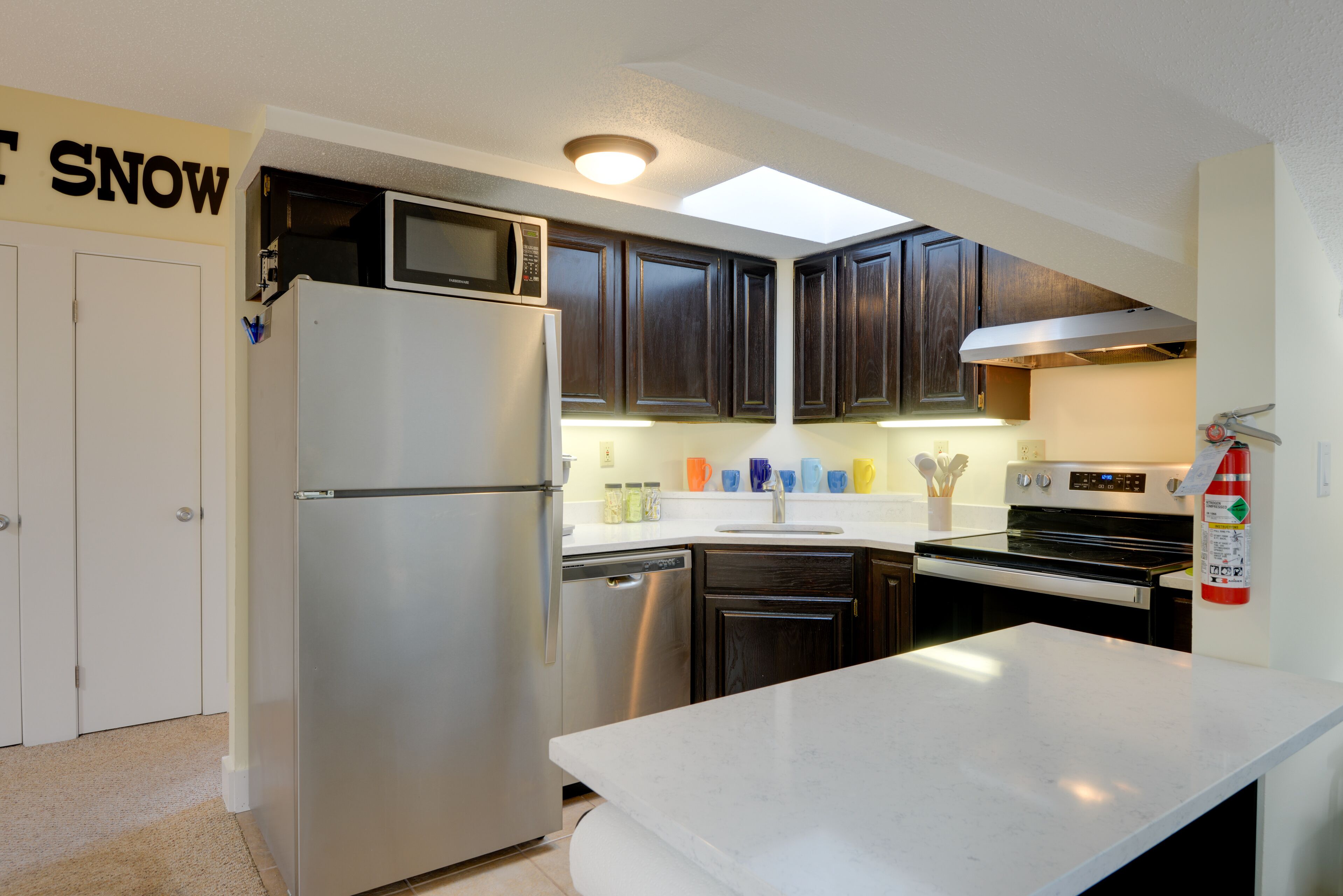 The condo features a fully stocked kitchen, perfect for preparing your favorite meals. The inviting living room offers a Roku TV for your entertainment and an electric fireplace to create a warm and cozy atmosphere. The bedroom provides a comfortable haven for a restful night's sleep, ensuring you wake up refreshed and ready for your next adventure.