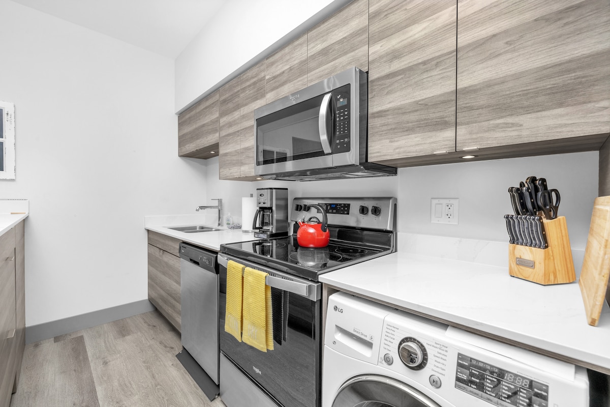 The open kitchen is equipped with stainless steel appliances, stove top, Keurig coffee maker, cookware, tableware and cutlery allowing easy dining and entertaining. The living room features a large smart TV and wireless Internet.