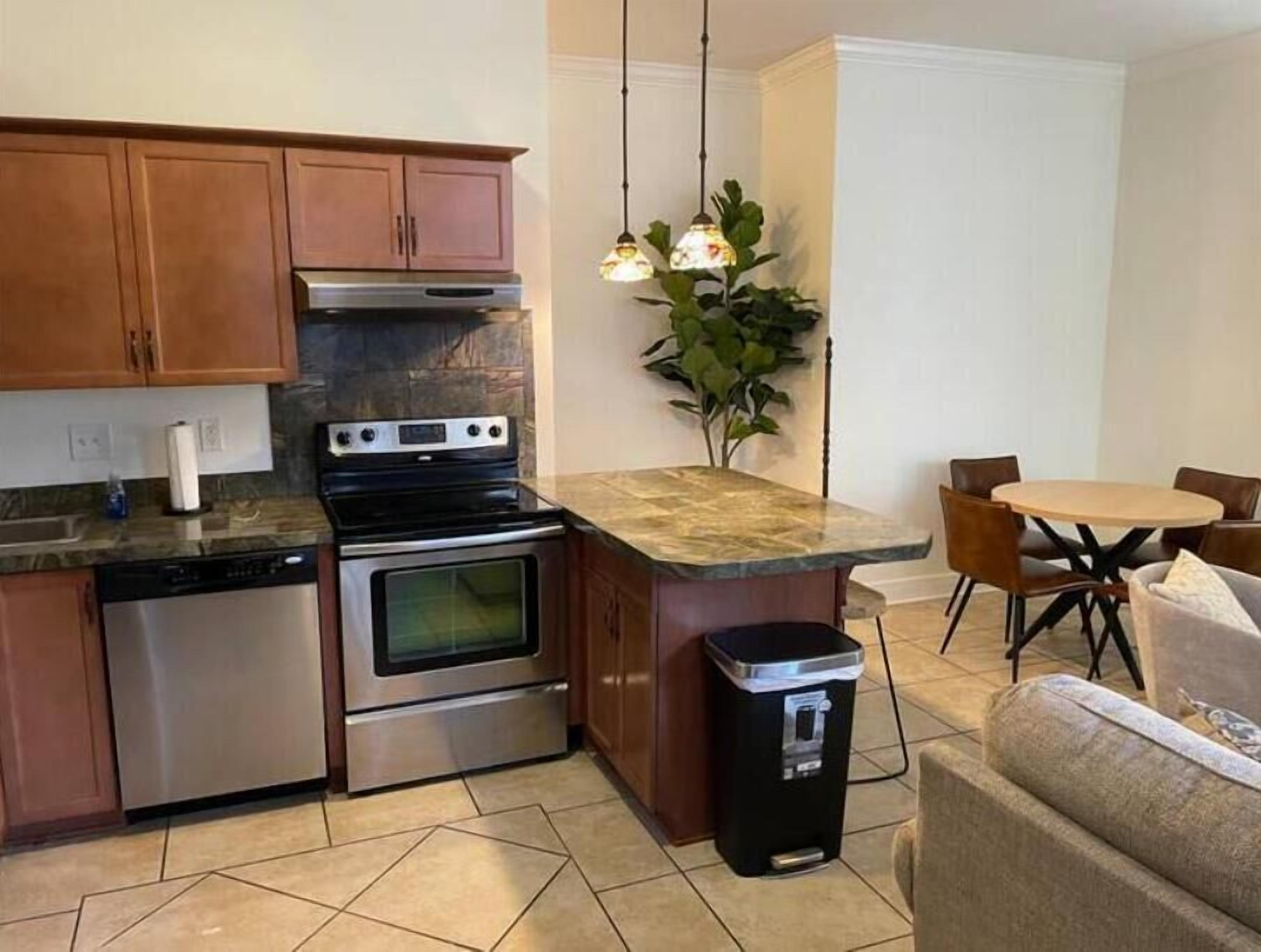 KITCHEN: Dishwasher, stove, fridge, stainless steel appliances, coffee maker, Crockpot, microwave, toaster, blender, hot water pot, dishware/flatware, spices, basic cooking essentials
