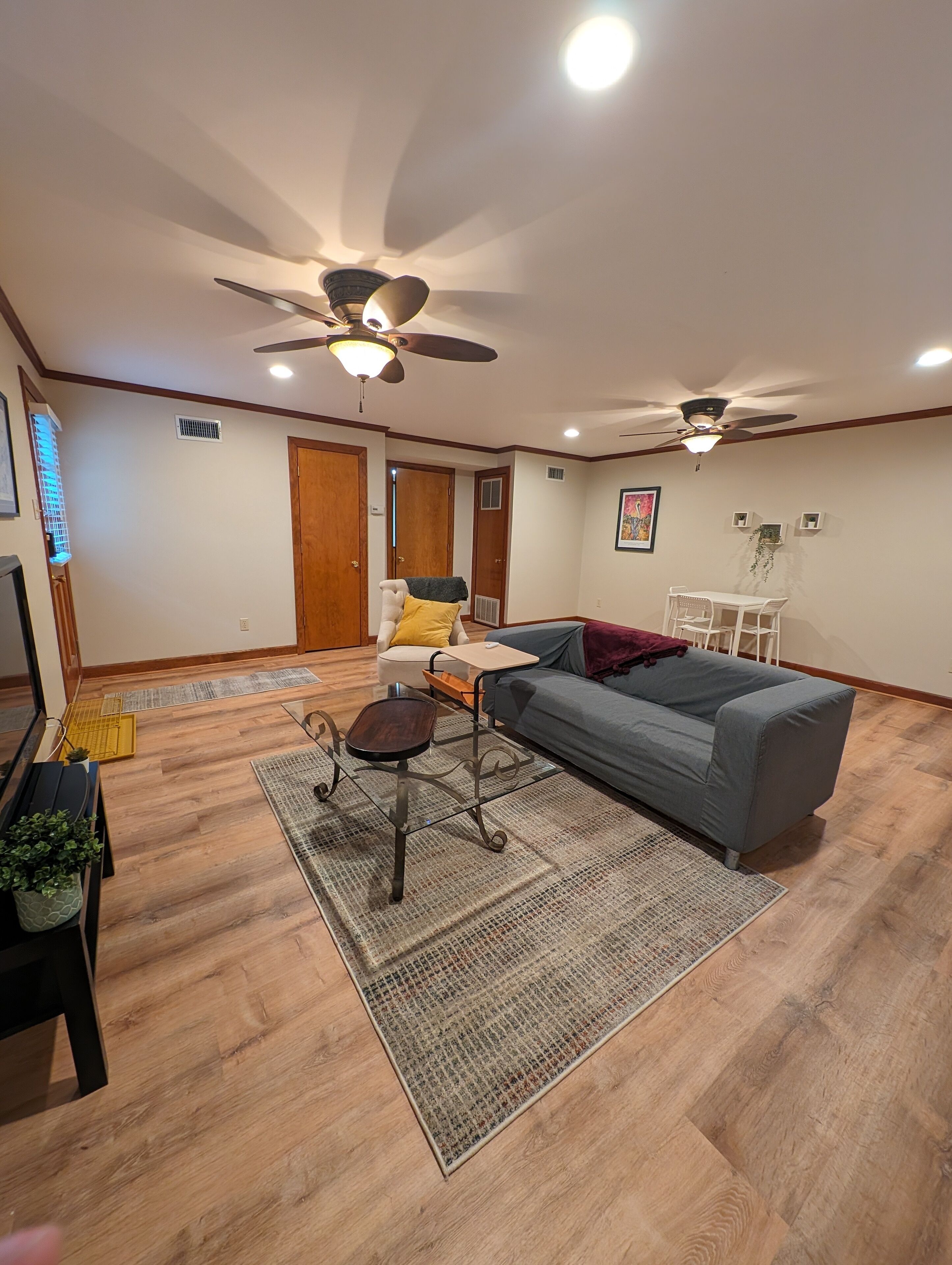 INDOOR LIVING: Smart TV, fireplace, ceiling fans, dining table
