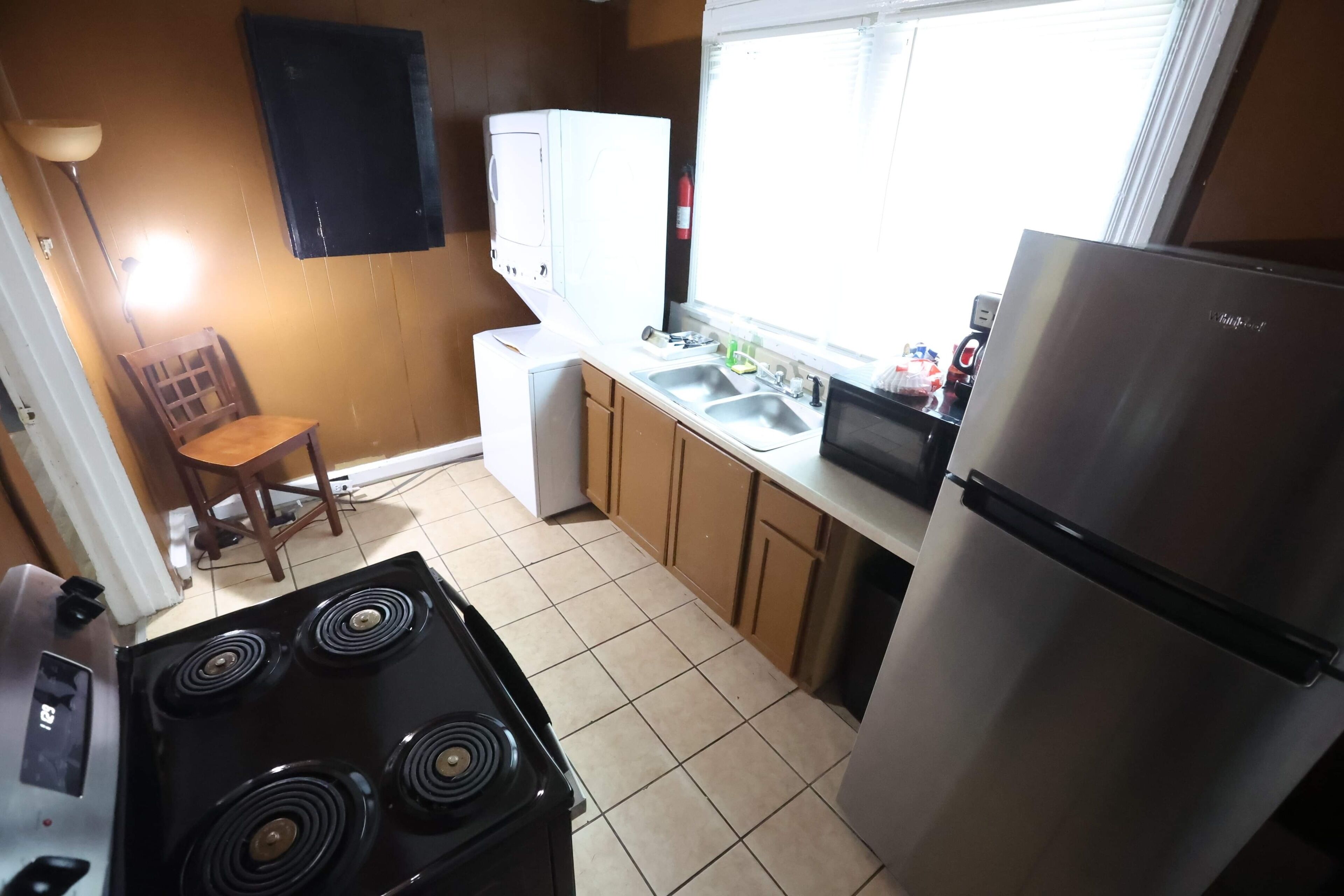 This is on the 2nd floor, so there is a flight of stairs. Kitchen is fully stocked with cookware, gadgets and utensils.