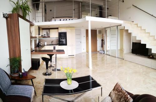 - "I had a great stay - the correspondence was very good between us. The apartment was super clean and stylish. It was easy to check in using a pin code. The block is above a food hall so plenty to eat of your door step. I'd stay again." - "We really liked the modern design and open feel to the property as well as the panoramic views of modern Vilnius. The property was very spacious and felt very luxurious. The area is right by a number of very large supermarkets as well as local bars and restaurants. It is a short walk or Uber to the historic old town."