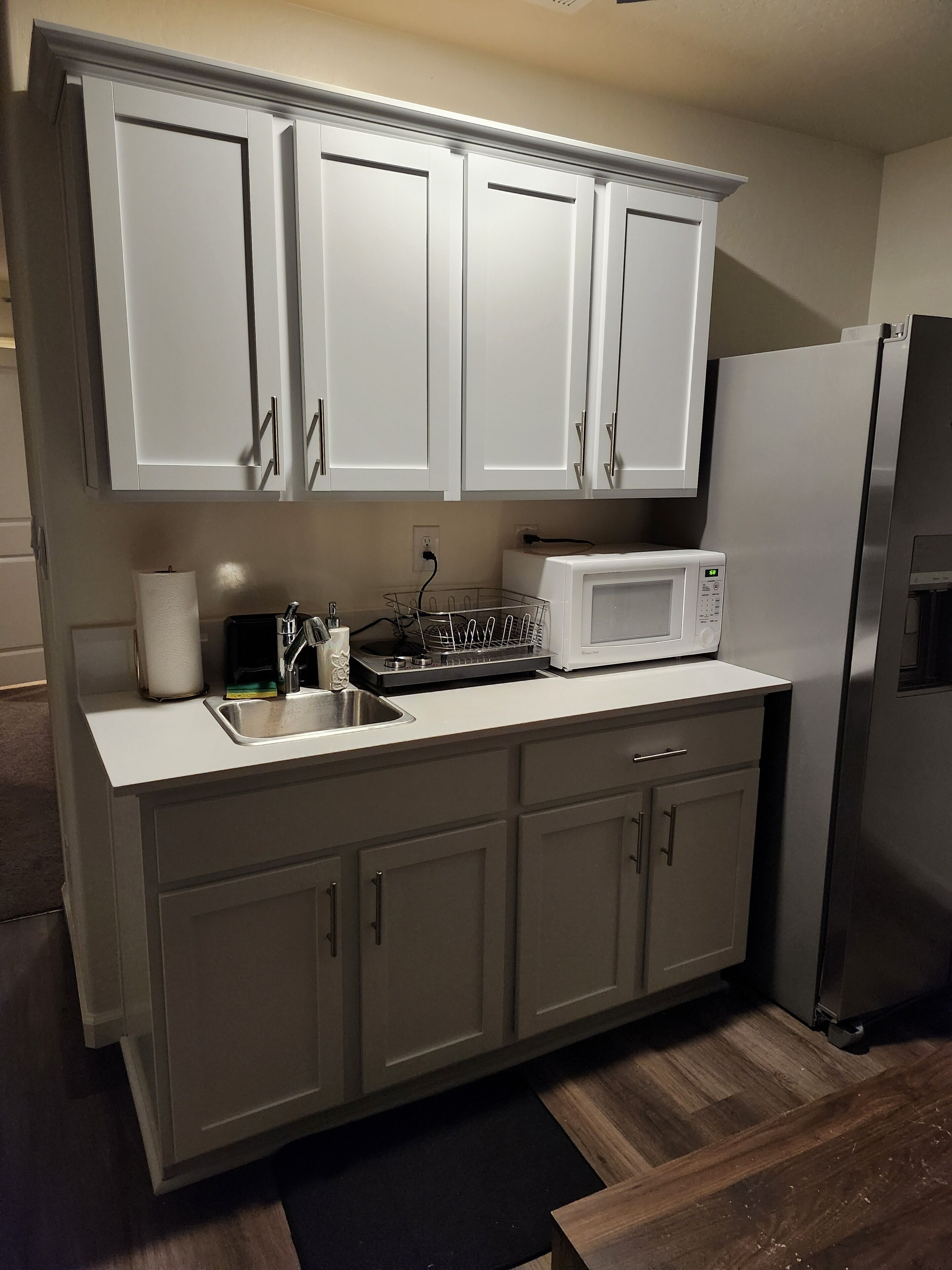 The kitchenette includes an electric pot, microwave, coffee maker, fridge, sink, counter space, dishes and supplies. There is also a cutting board, seasonings, and a large free-standing George Foreman grill outside the door.