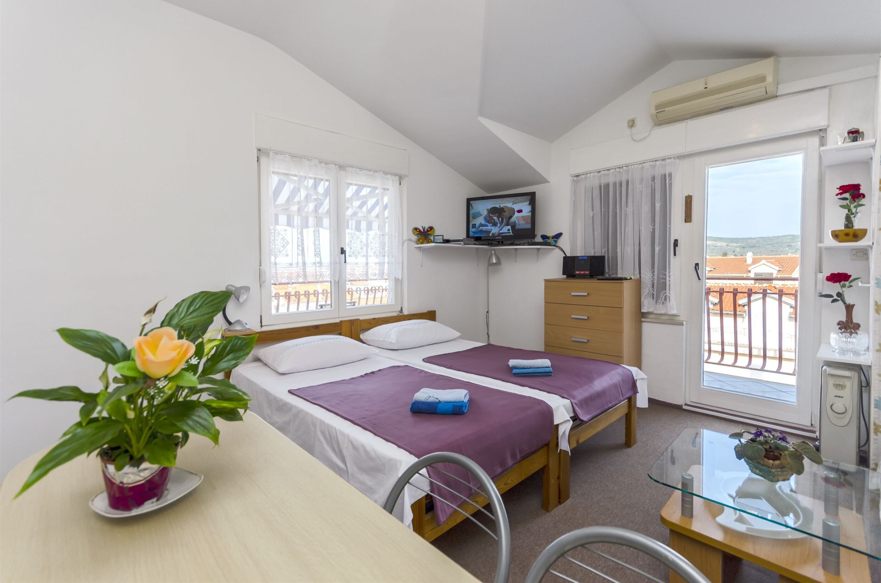 The room (2+0) is small, cozy room for two, located on 2. floor of house (no balcony). There is double bed, bathrom, air conditionr, TV+SAT, Internet, fridge, kettle, glasses and cups for coffee.