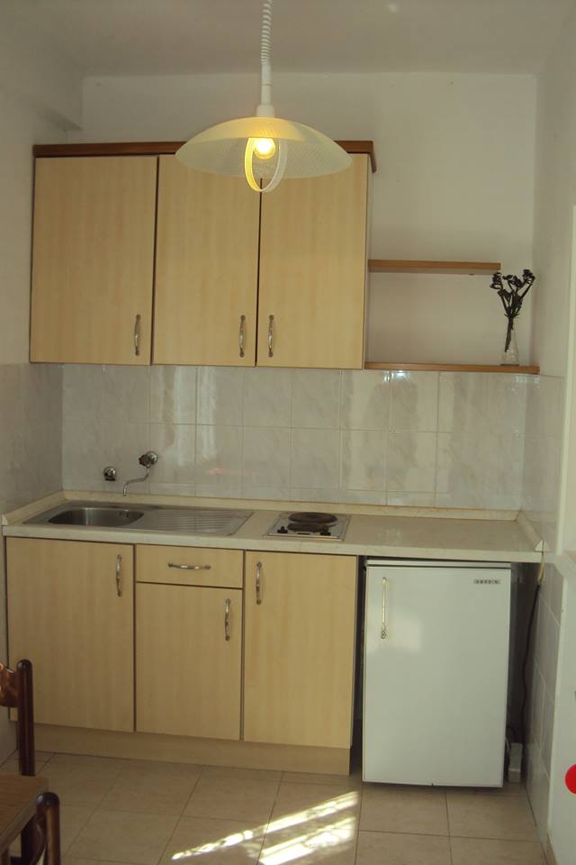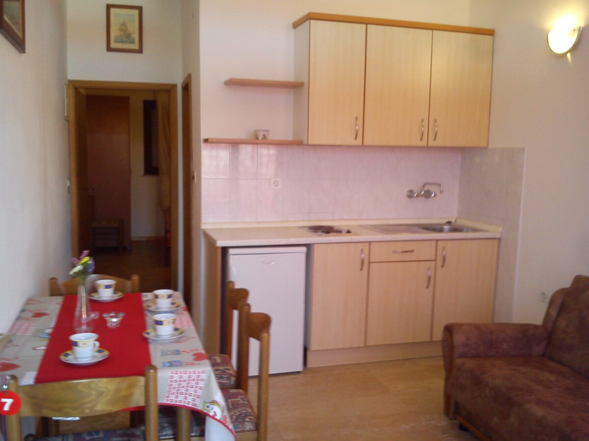 The apartment is located on the first floor . It has one room where there is a double bed and there is a sofa in the kitchen for two ososbe.
