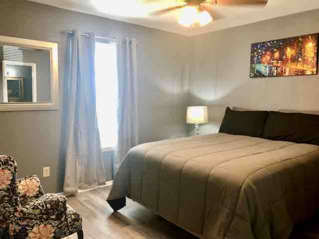 Welcome to our Waco retreat, where an open floor plan combines living, kitchen, and reading areas with a king-size bed, creating a spacious yet cozy atmosphere. A separate bedroom offers a twin bed and TV, perfect for relaxation. There is also a Queen Size Inflatable Air Matress available for you if you need an extra bed. With a full bathroom and laundry room, this compact space is designed for comfort and convenience, ensuring a memorable stay in the heart of Waco.