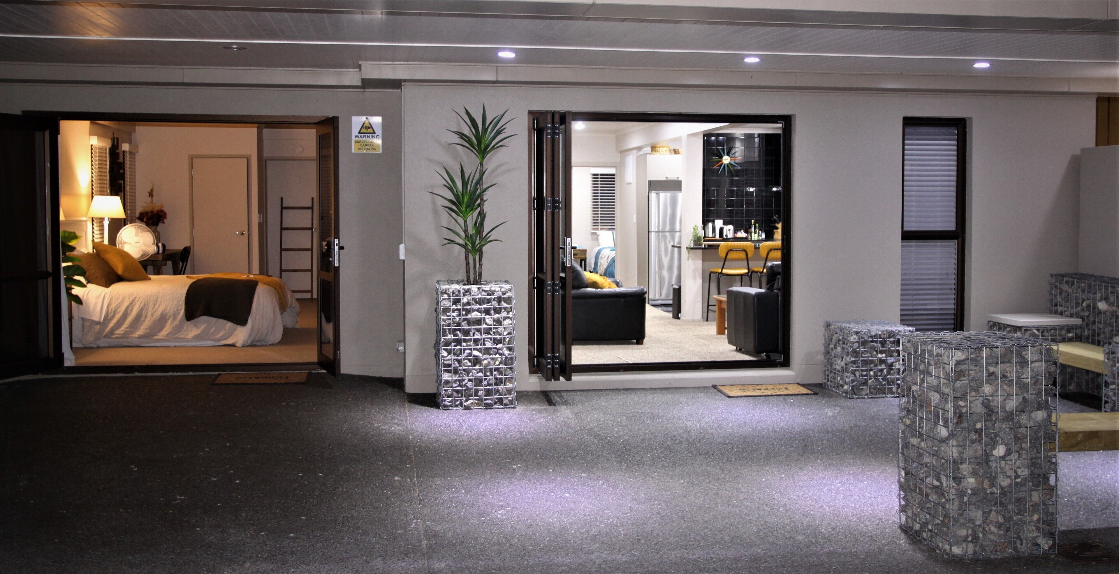 The space consists of a comfortable lounge area, with new TV and sonos speaker. There is a small kitchenette consisting of fridge, microwave, kettle and toaster - crockery, cutlery including complimentary tea and coffee. The rooms contain a Queen bed in one, and 2 x King single beds in the second room.