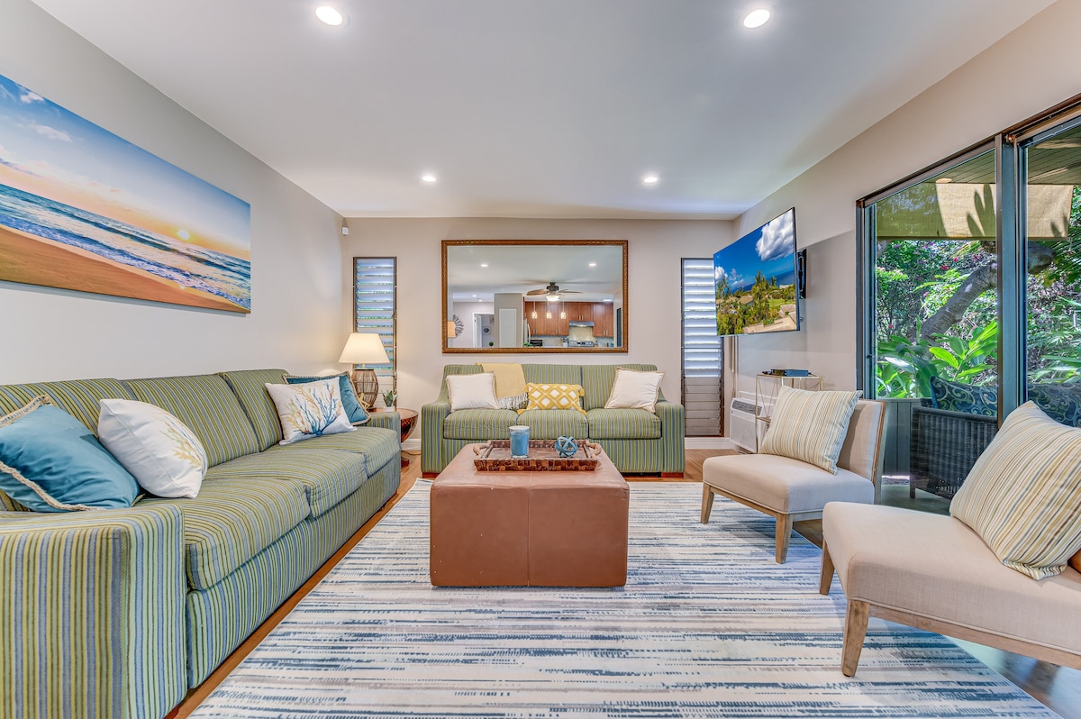 Upon entering, you’ll be greeted by the immediate WOW factor of the open-concept living space, complete with vaulted ceilings and an electric yet sophisticated coastal vibe. The thoughtfully designed interiors reflect the natural coastal beauty of Maui, with soft blues and teals complementing the textures and tones throughout the home. The living area flows effortlessly into the fully covered lanai, where you can dine outdoors, read, or simply relax while soaking in the ocean views.