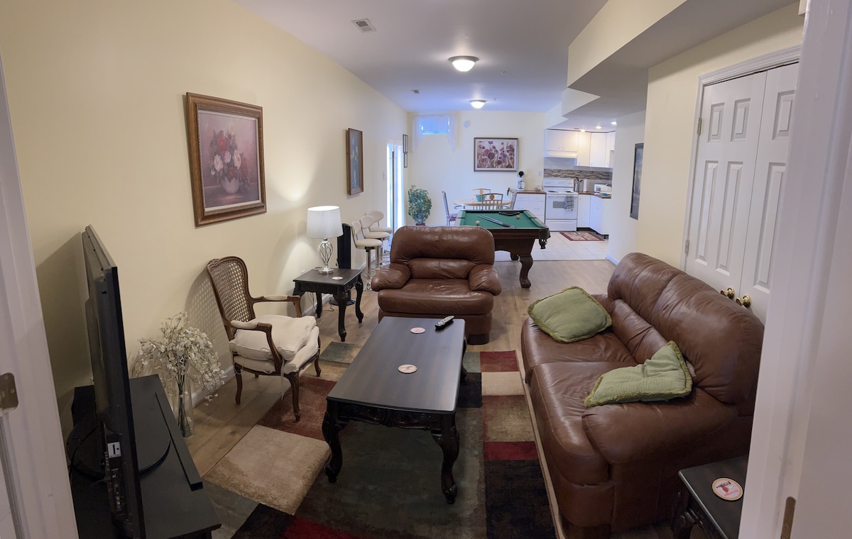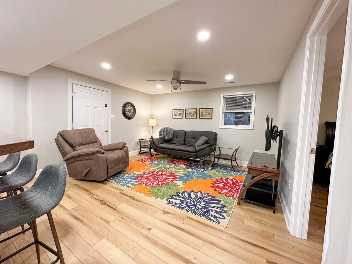 Newly Renovated Light airy 1 BR (QN) basement apartment in a single family home in quiet residential neighborhood. We live upstairs. YOUR SPACE IS FULLY PRIVATE & SECURE. PRIVATE KEYPAD ENTRY. LR has 2 sofas & high quality Full air mattress. Perfect for 2 couples or a small family. Modest travel distance from DC metro area and the Potomac Corridor. Washington DC, National Harbor, the Chesapeake Bay, the Northern Neck of VA, and historic sites like Mt Vernon, and Old Town Alexandria are nearby.