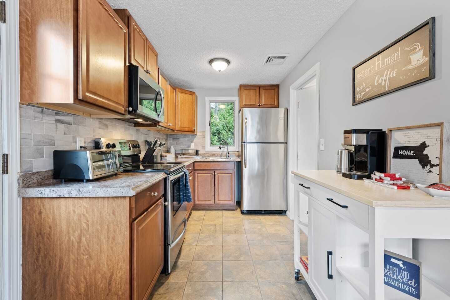 No carpet! Professionally cleaned regularly. Modern design with all new appliances, fully stocked kitchen: stay 1 night or 6 months, we have everything you need. Coffee maker, k-cups, cream/sugar all provided.